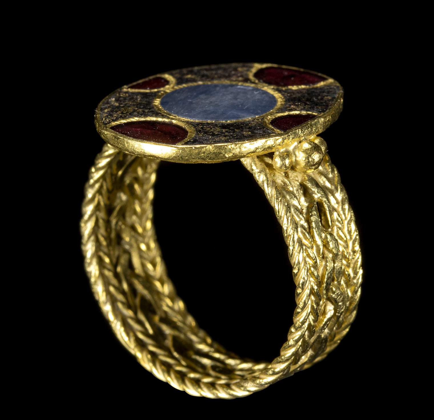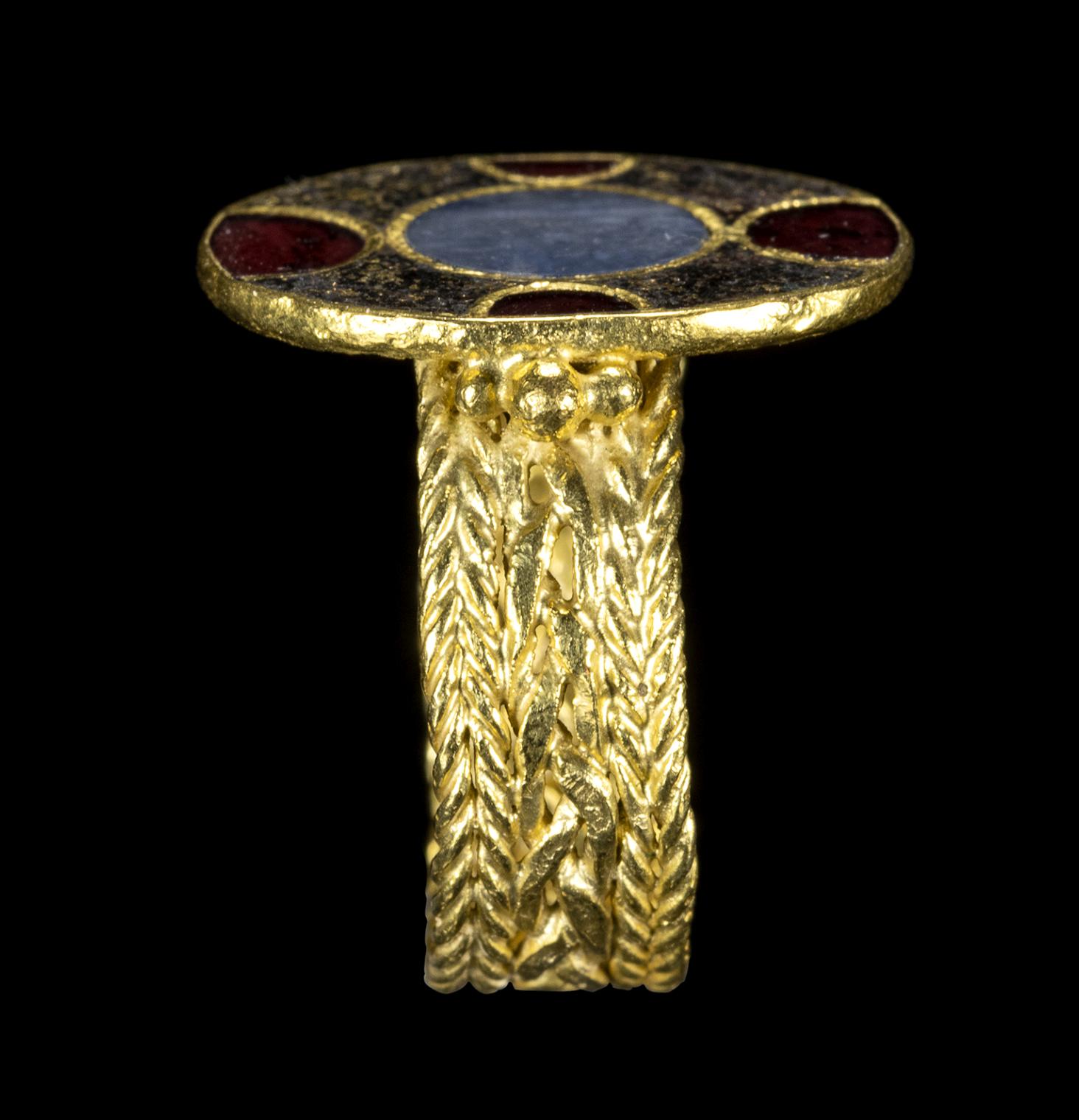 A LARGE SAXON GOLD RING WITH BREADED SHANK AND BLUE CHALCEDONY, GARNETS AND GLASS PASTE ON THE BEZEL.
