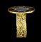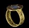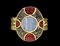 With rounded bezel composed of braided gold wires surmounting an oval gold box-setting. At the junction on each side, three spherical gold beads. The box setting is inlaid with semi-spherical garnet, in the center a chalcedony disc, and dark glass mixed with gold dust, all divided in section by hammered gold plates.