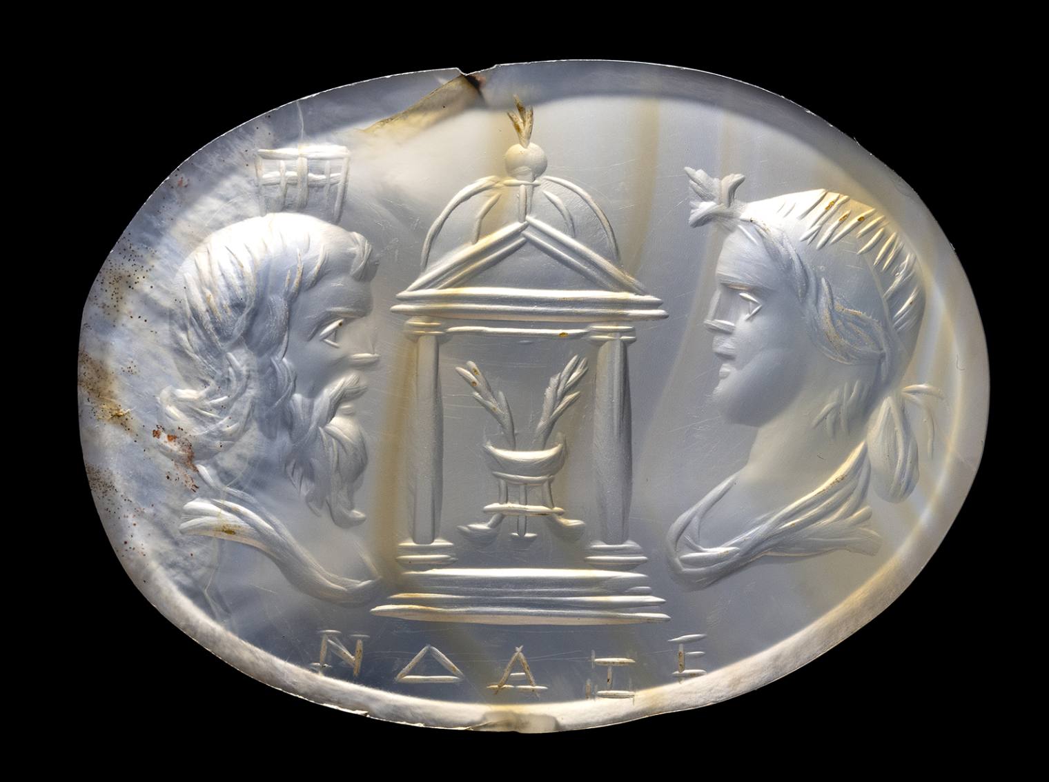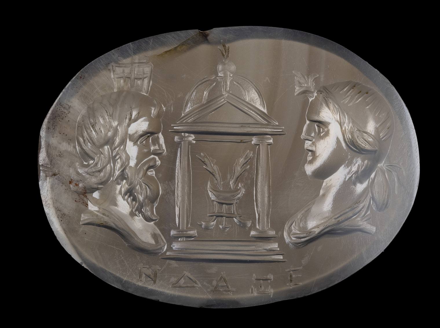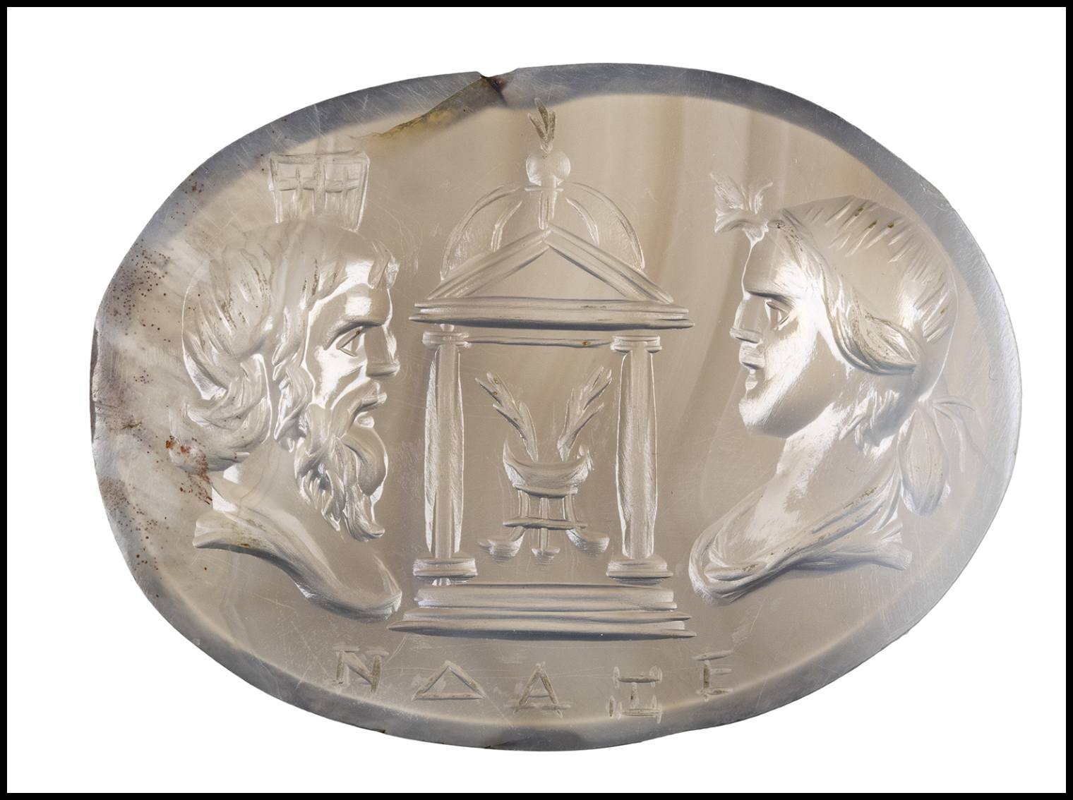 A LARGE POSTCLASSICAL CHALCEDONY INTAGLIO. TWO BUSTS WITH A SMALL NAISKOS.