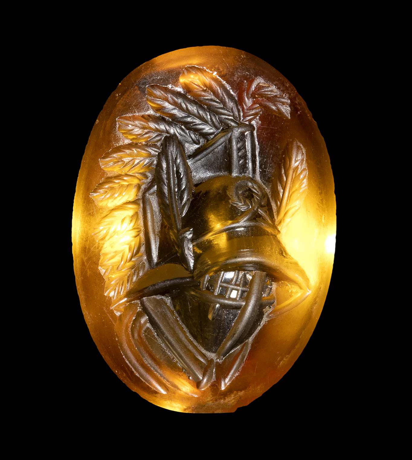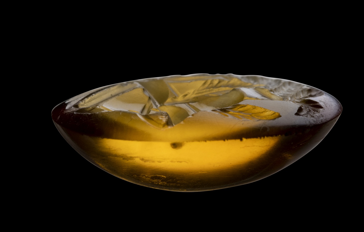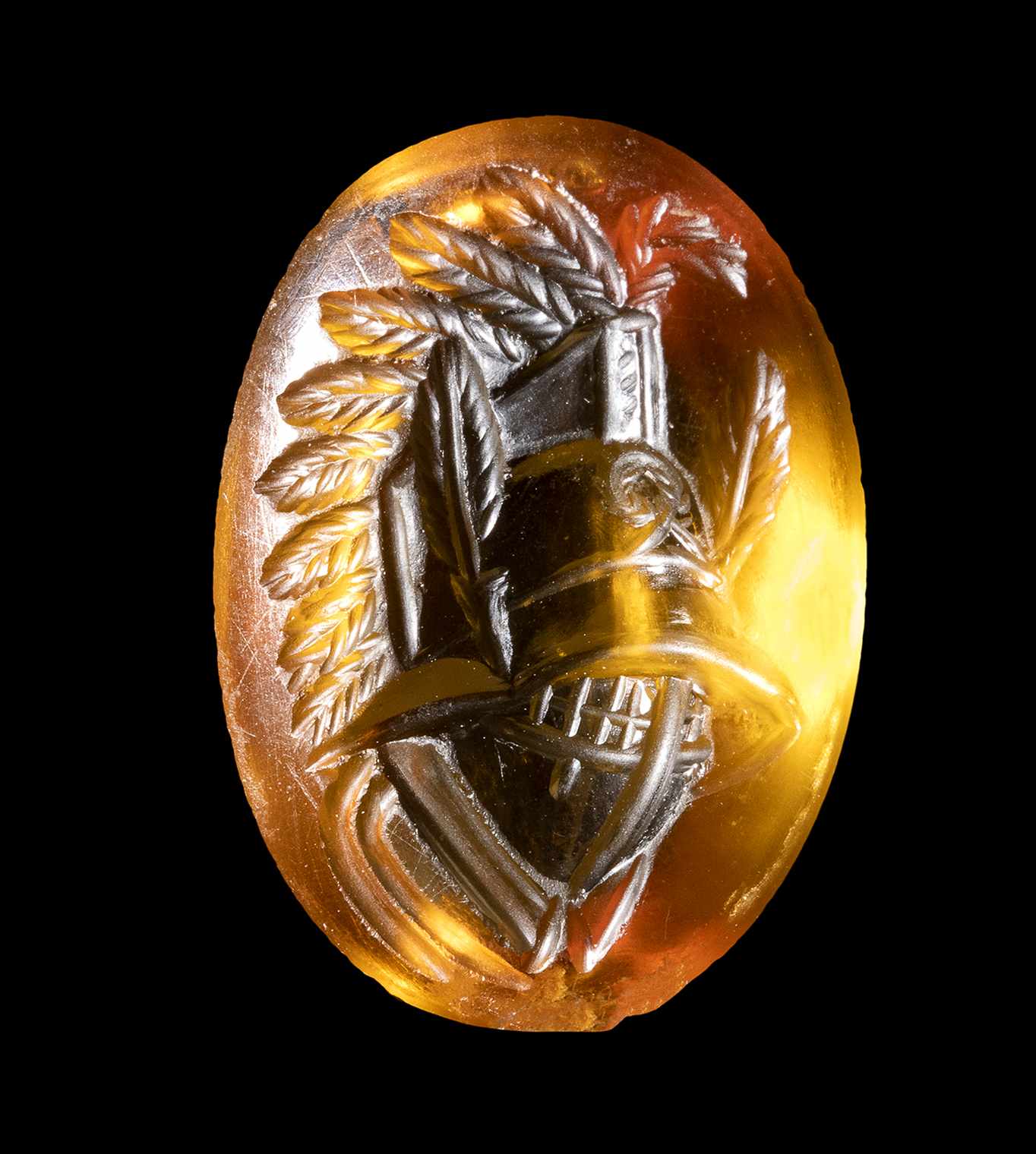 Gladiator's helmet depicted in three-quarters view facing right. The helmet is a "Murmillo" type and is decorated with numerous feathers and a small laurel wreath engraved on the helmet, as a symbol of triumph. Wear marks. In front of the stone is slightly convex, while behind a lot of cabochons. The gem is characterized by an attractive honey amber tone color and an extraordinary brilliance. Rare subject. Postclassical stone.