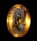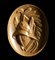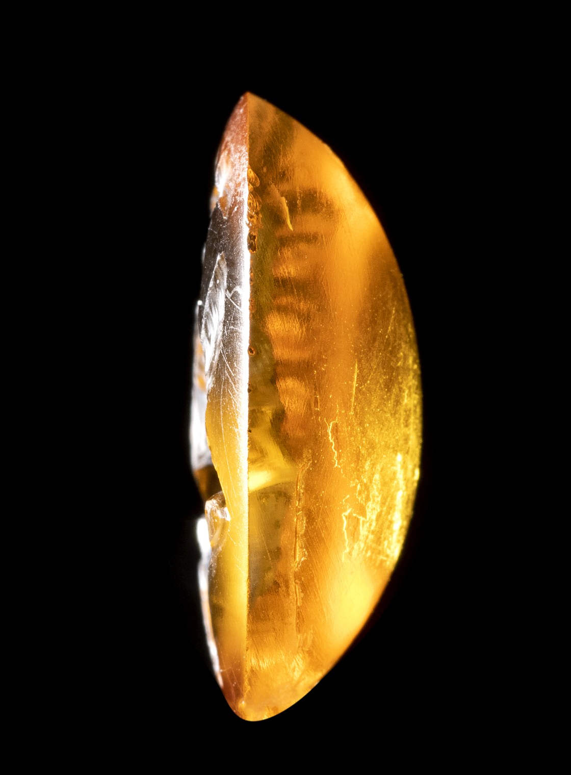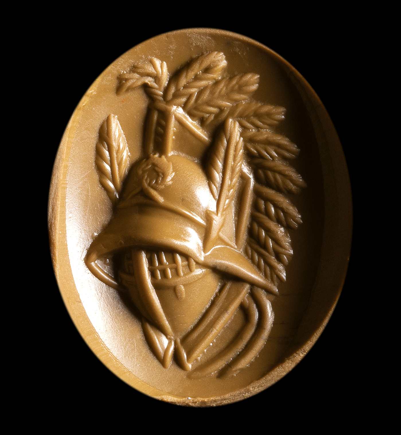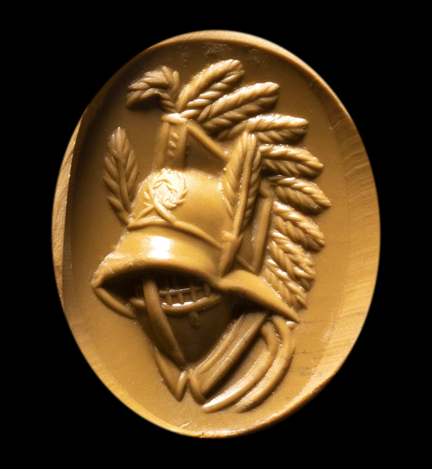 Gladiator's helmet depicted in three-quarters view facing right. The helmet is a "Murmillo" type and is decorated with numerous feathers and a small laurel wreath engraved on the helmet, as a symbol of triumph. Wear marks. In front of the stone is slightly convex, while behind a lot of cabochons. The gem is characterized by an attractive honey amber tone color and an extraordinary brilliance. Rare subject. Postclassical stone.