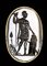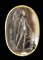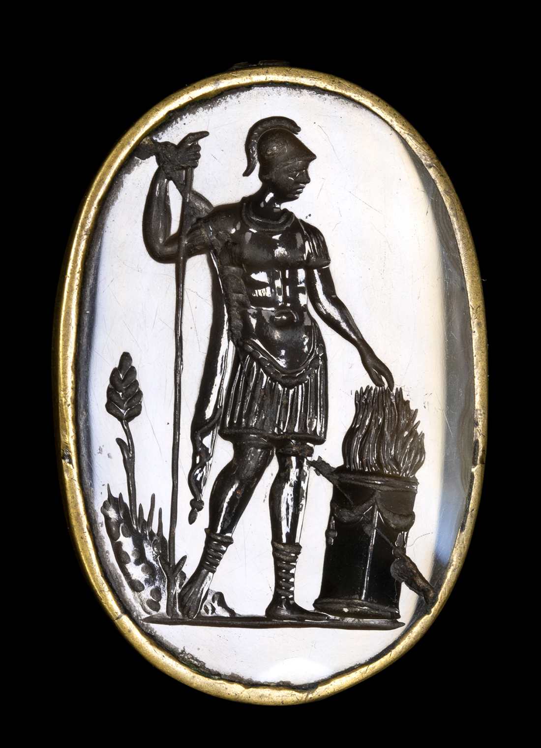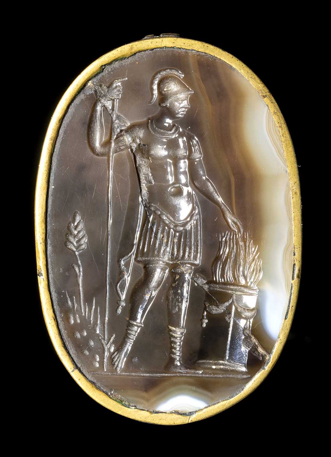 The soldier is standing facing right, wearing armour, helmet and cloak. With his right hand he holds a spear, while he places his left hand above the fire of a burning altar in his famous gesture of courage and virtue. The scene symbolizes the power of Roman Virtus. Nice choice of zoned agate, unfortunately brocken in two parts diagonally. The stone is fixed in a metal frame. Wear marks.