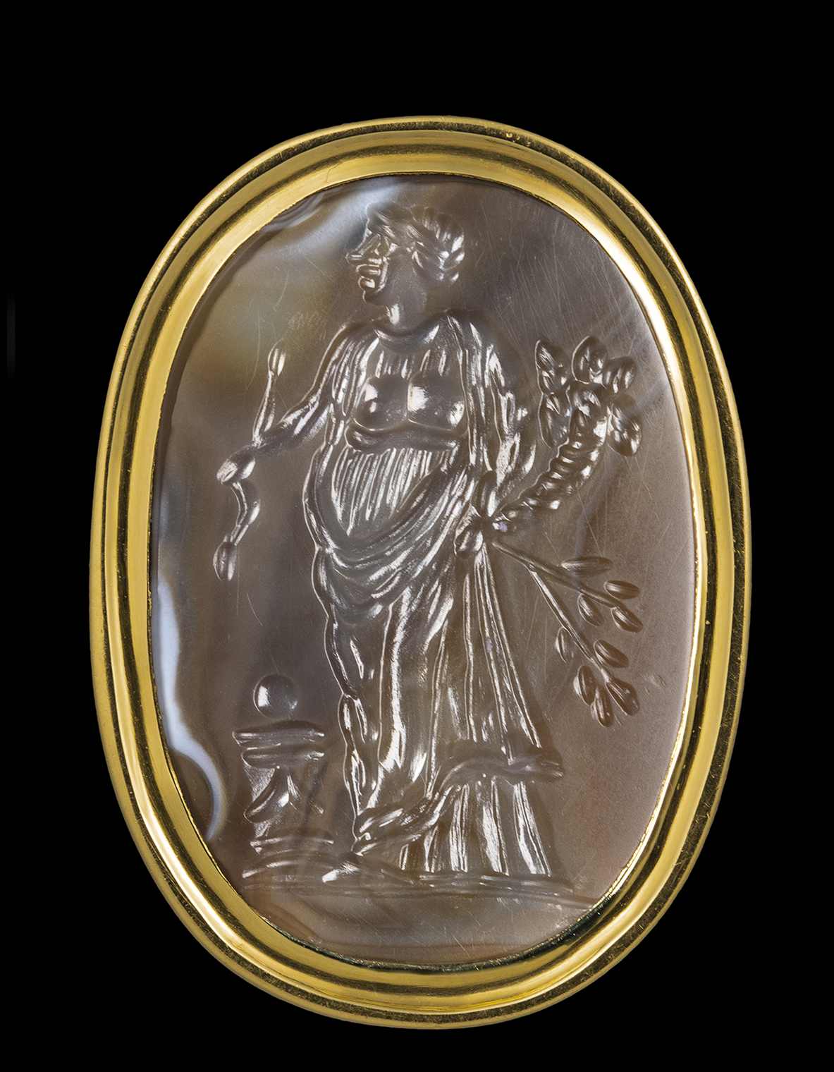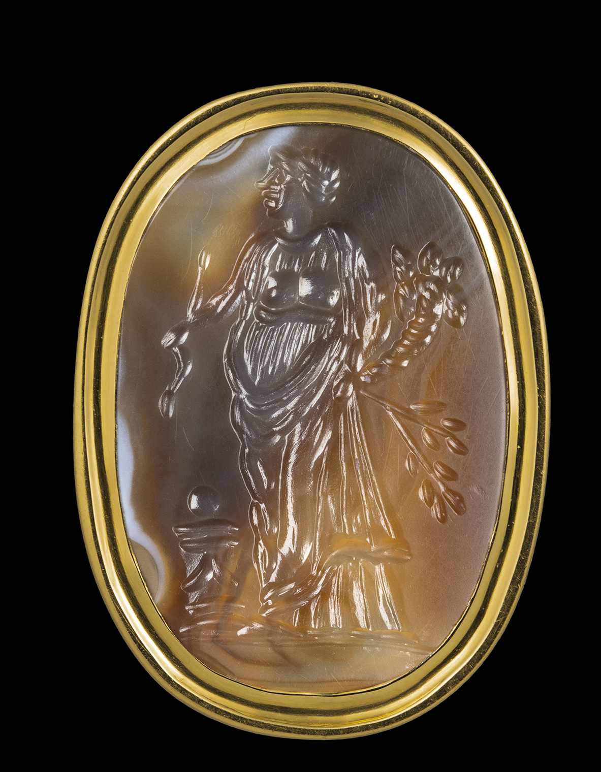 A LARGE AGATE INTAGLIO SET IN A GOLD RING. ALLEGORICAL FIGURE.