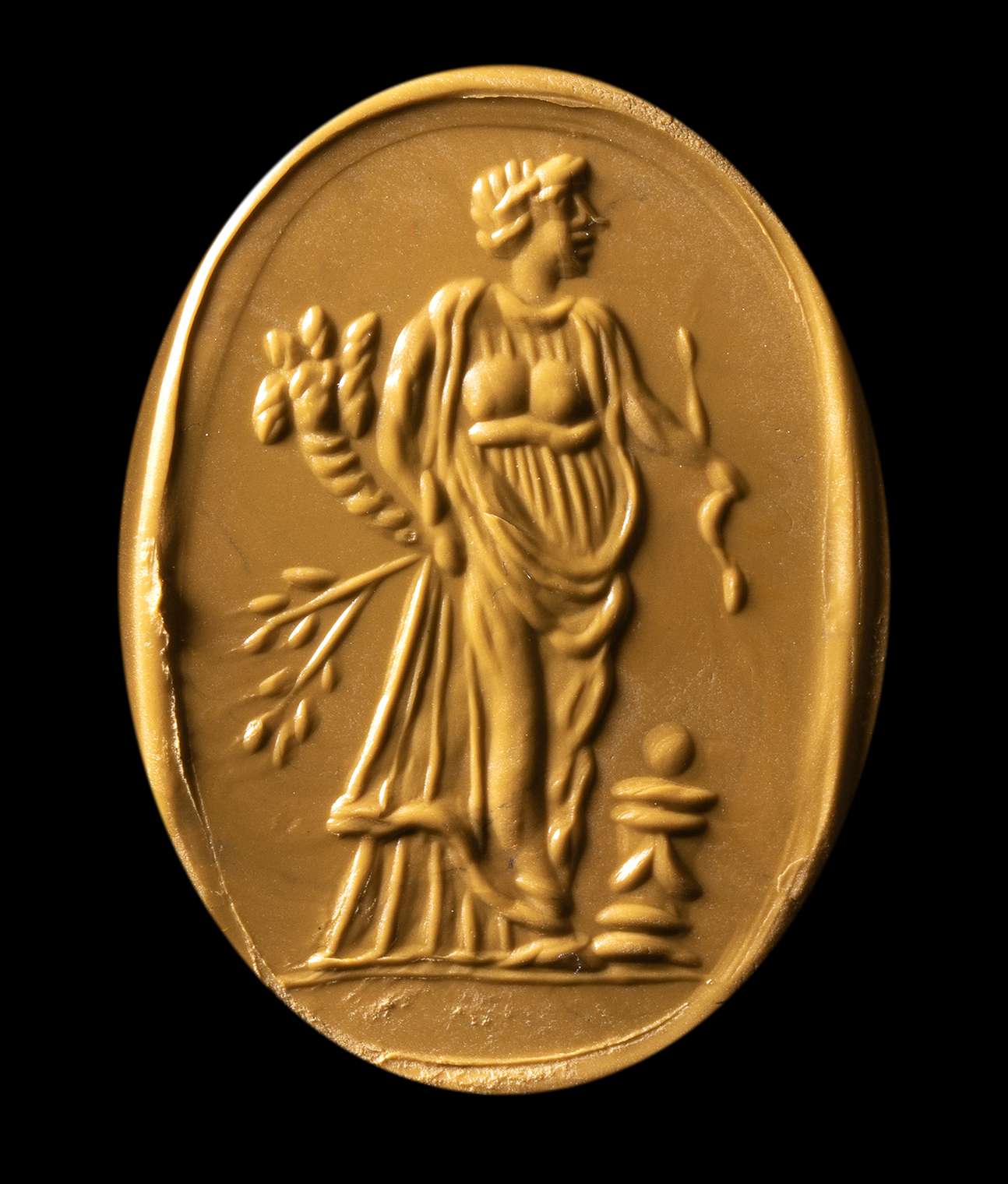 Female figure draped and standing with head to the left, holding a snake in her right hand, with a cornucopia and a laurel (or olive) branch in her left hand. Below, a small altar is above a globe. Allegorical figure referable to abundance and good health. North italian atelier. Beautiful choice of the stone. Slight wear marks.
