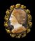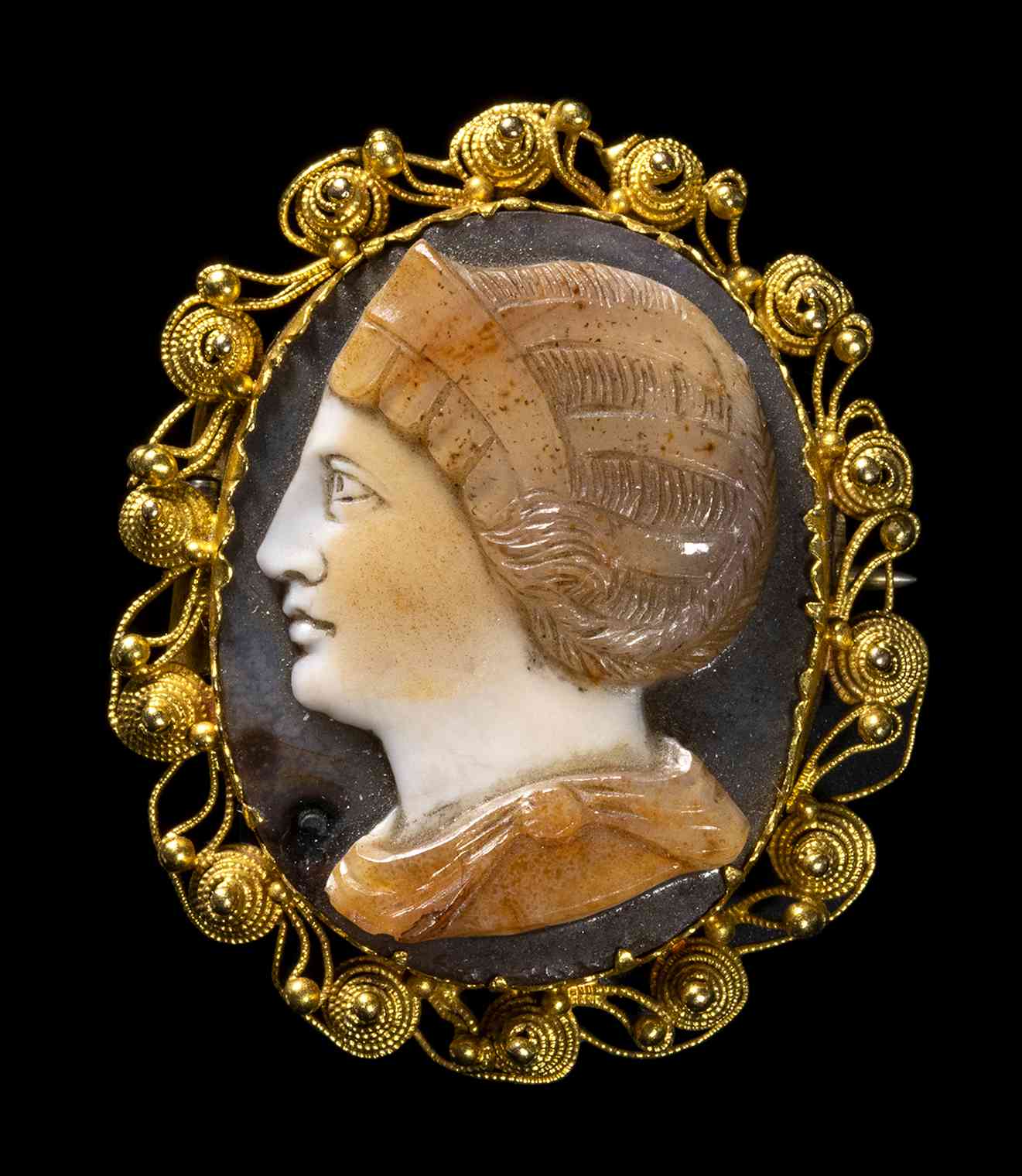 The effigy faces left, is diademed and is characterized by a hair typical of the Roman imperial portraits of the end of the second century A.D. The bust is tunicated. The engraver skilfully used the three different layers of the agate. The cameo is mounted in a later delicate gold brooch.