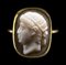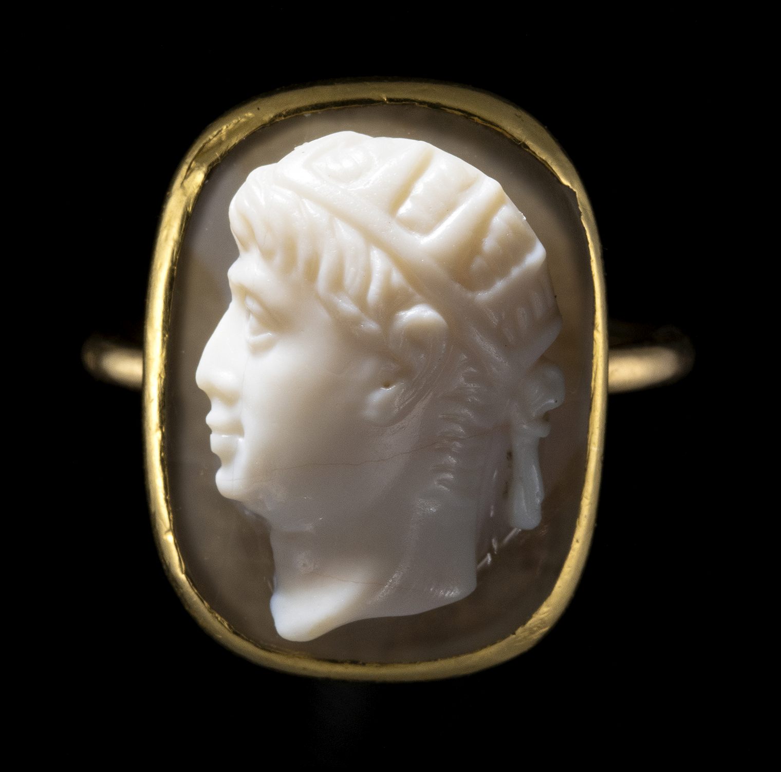 Interesting expressive portrait of a Roman emperor characterized by youthful traits and a radiate crown, to the left. Slight natural cracks in the stone only on the surface. Slight wear marks. Later gold mounting.