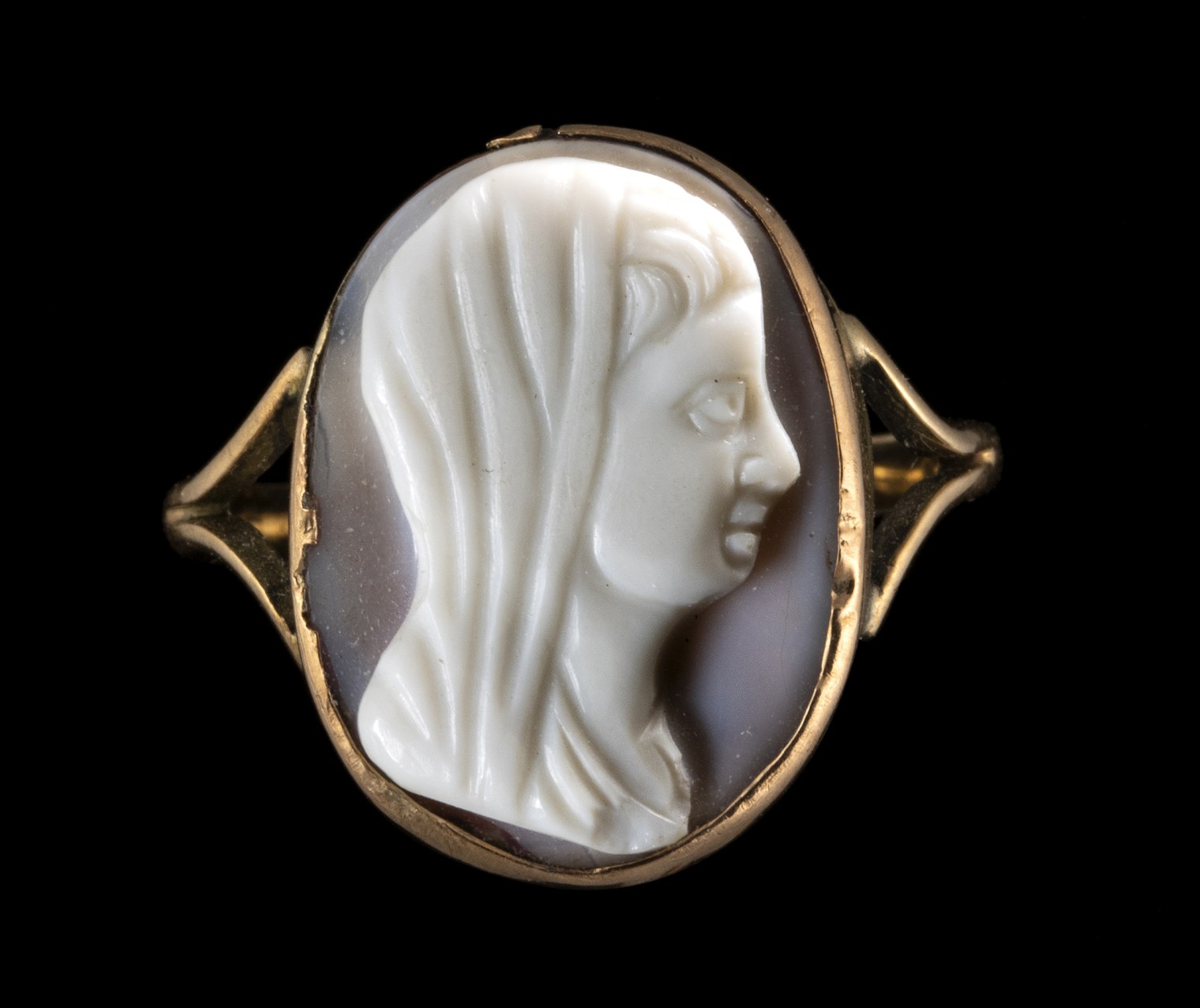 AN AGATE CAMEO SET IN A GOLD RING. VEILED BUST OF A YOUTH.