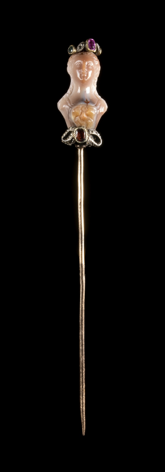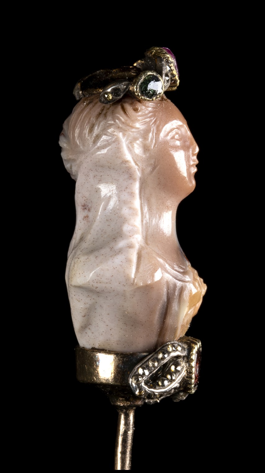 AN AGATE BUST OF A WOMAN MOUNTED IN A GEORGIAN GOLD STICK PIN WITH STONES.