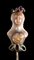 A small female bust carved in a pinkish agate with orange and bluish tones, ornated by a crown and a ribbon with semiprecious stones.