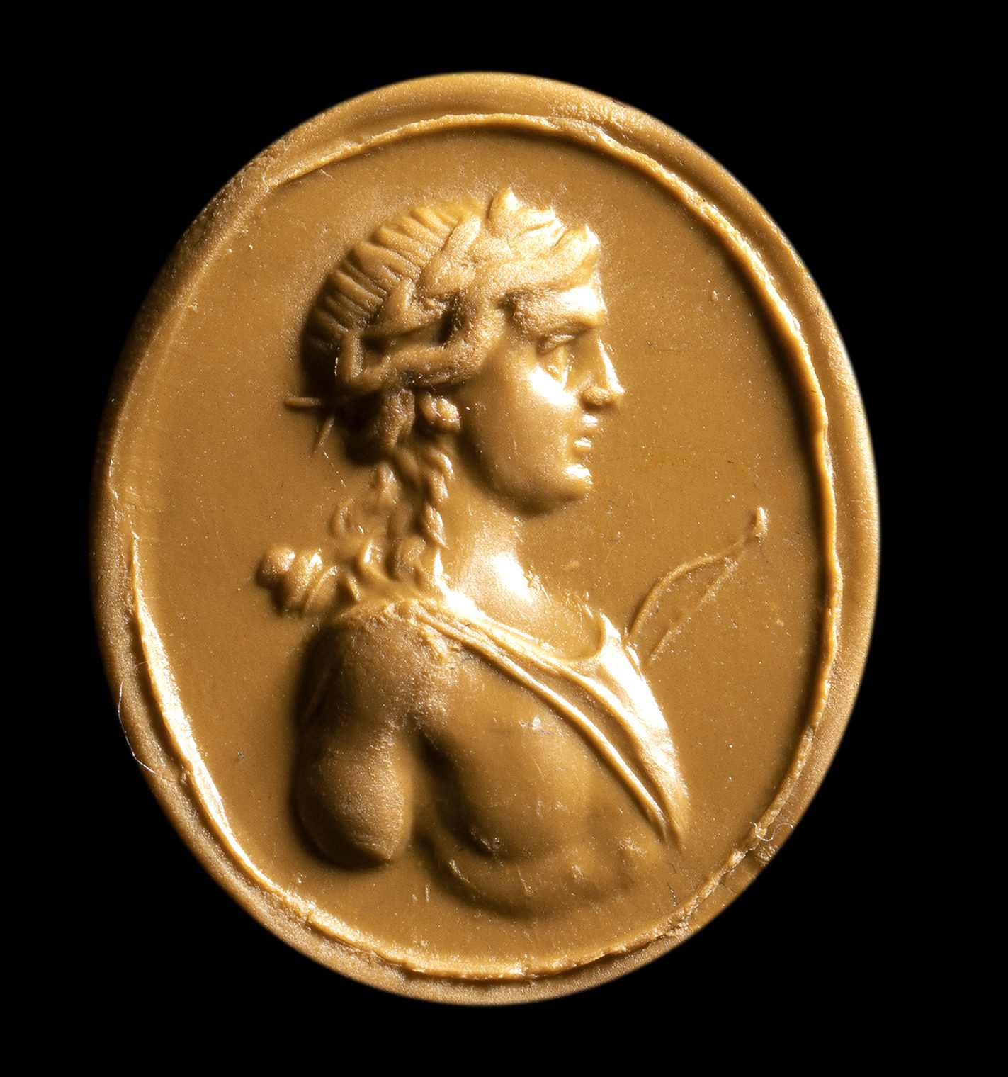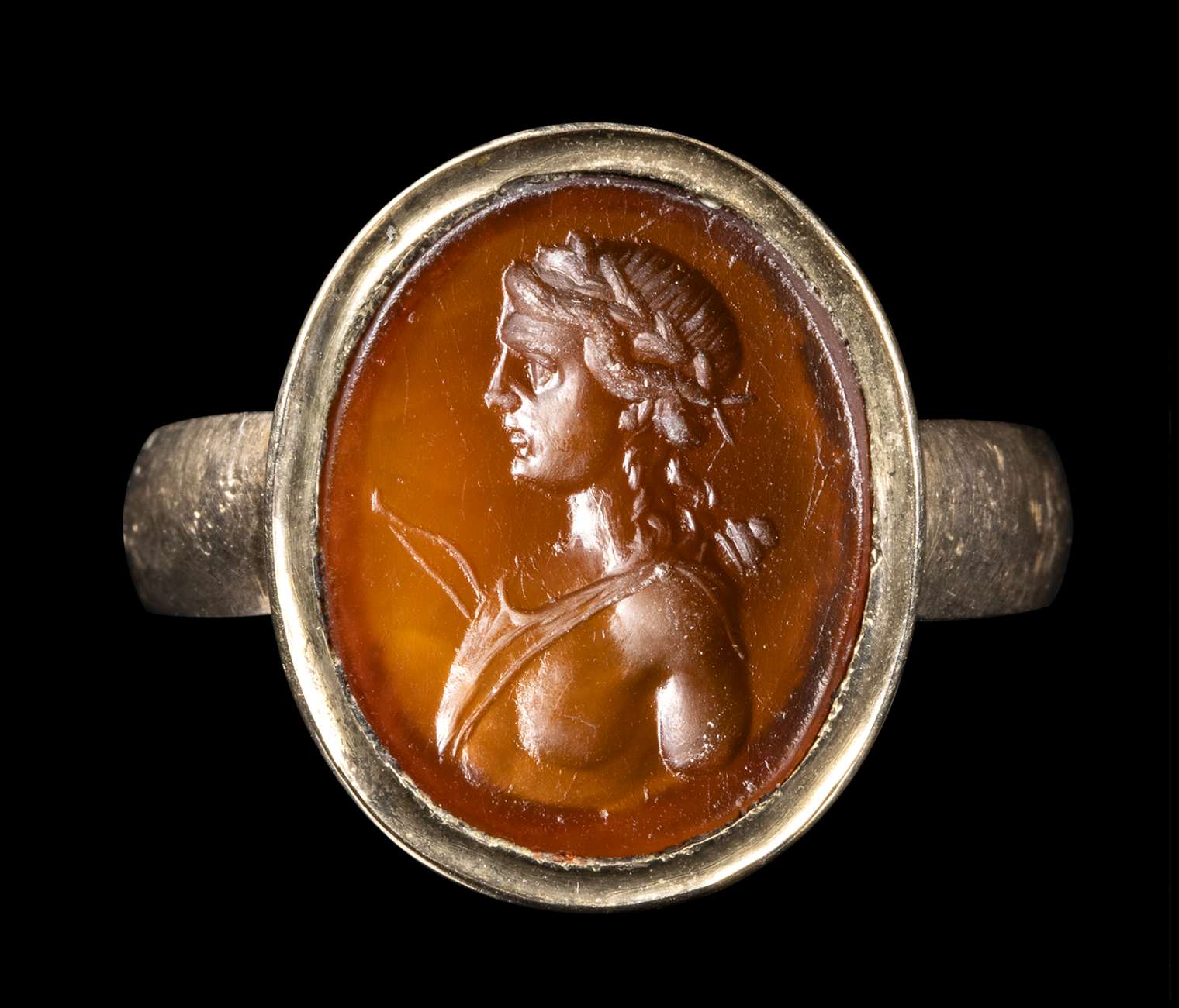 Lotto 352 | A CARNELIAN INTAGLIO SET IN A GOLD RING. BUST OF APOLLO.