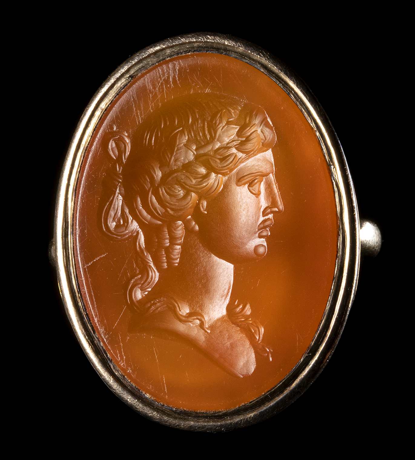 A NEOCLASSICAL CARNELIAN INTAGLIO SET IN A GOLD RING. BUST OF DIONYSOS.