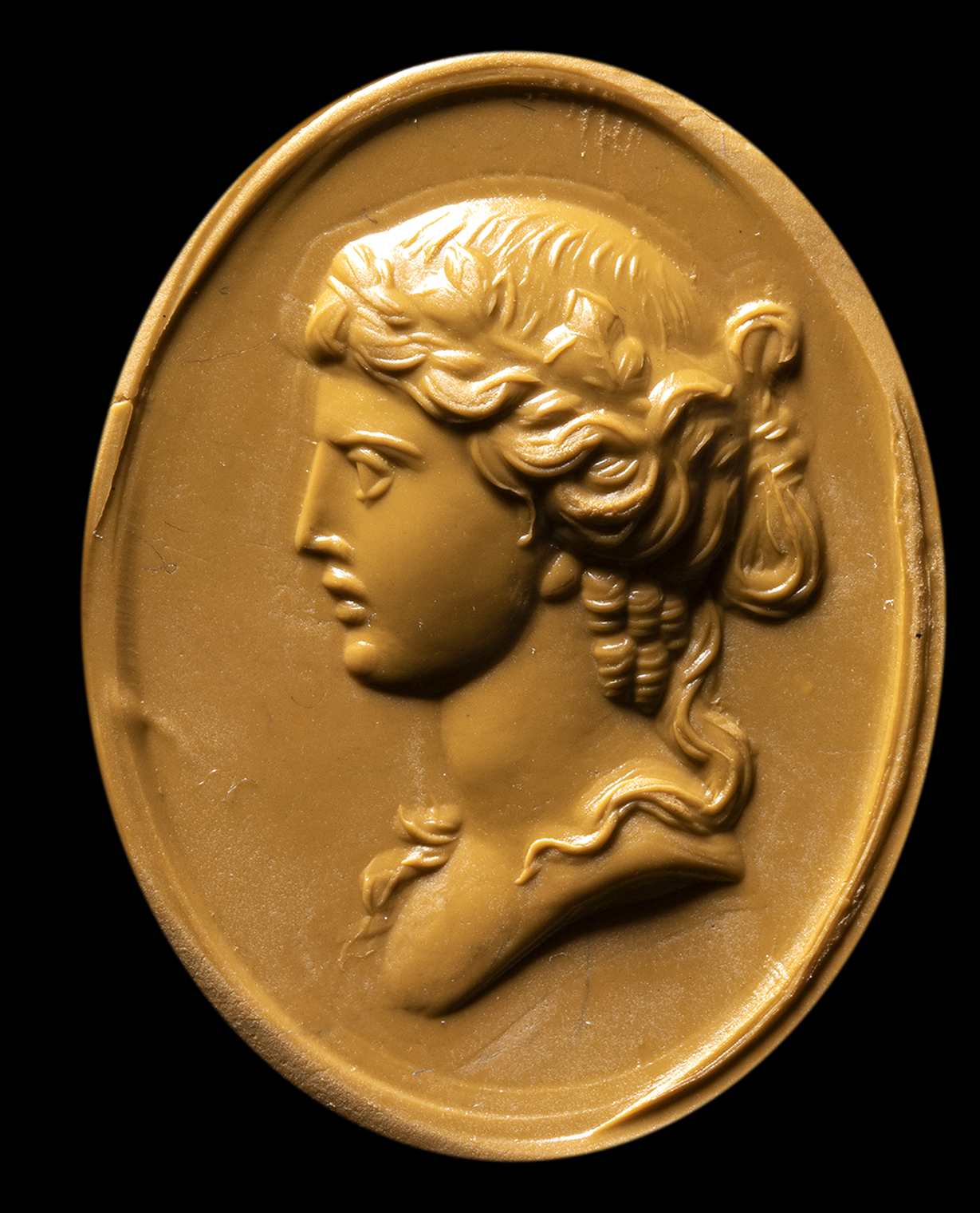The god is facing right and characterized by young features. The hair are assembled behind in a knot-bun with a large braided band around the face hold by an ivy leaves crown. Wear marks.