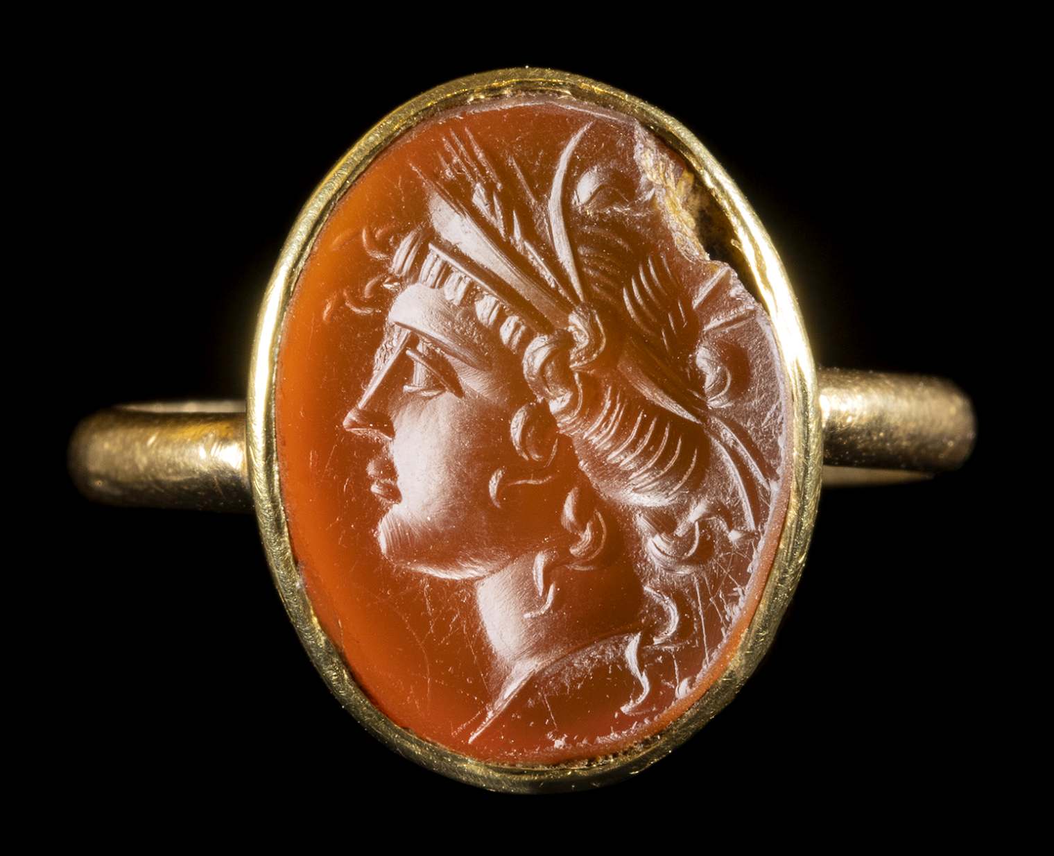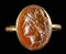 A GRAND TOUR CARNELIAN INTAGLIO SET IN A GOLD RING. HEAD OF PERSEPHONE.