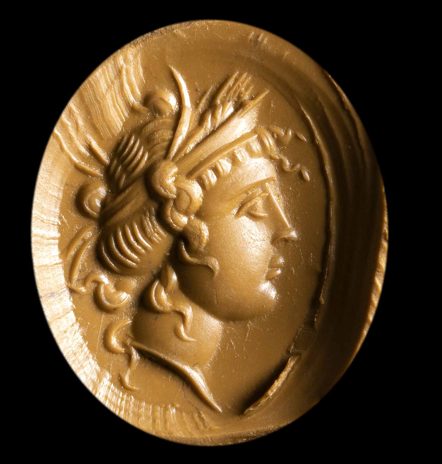 With plain rounded hoop and oval bezel set with an intaglio showing the head of Persephone facing left with her ear of corns diadem. Missing and chip on the edge. Wear marks.