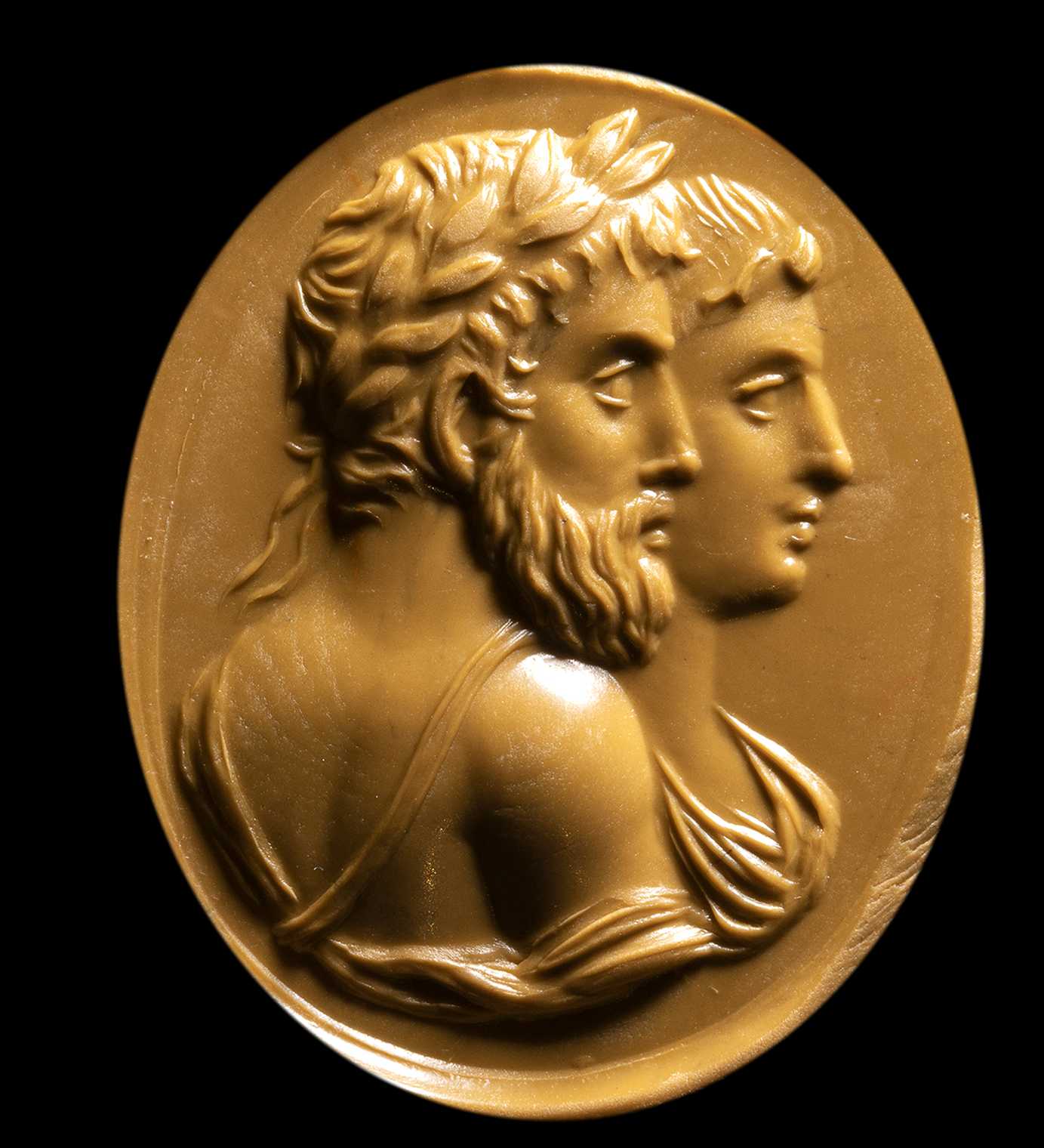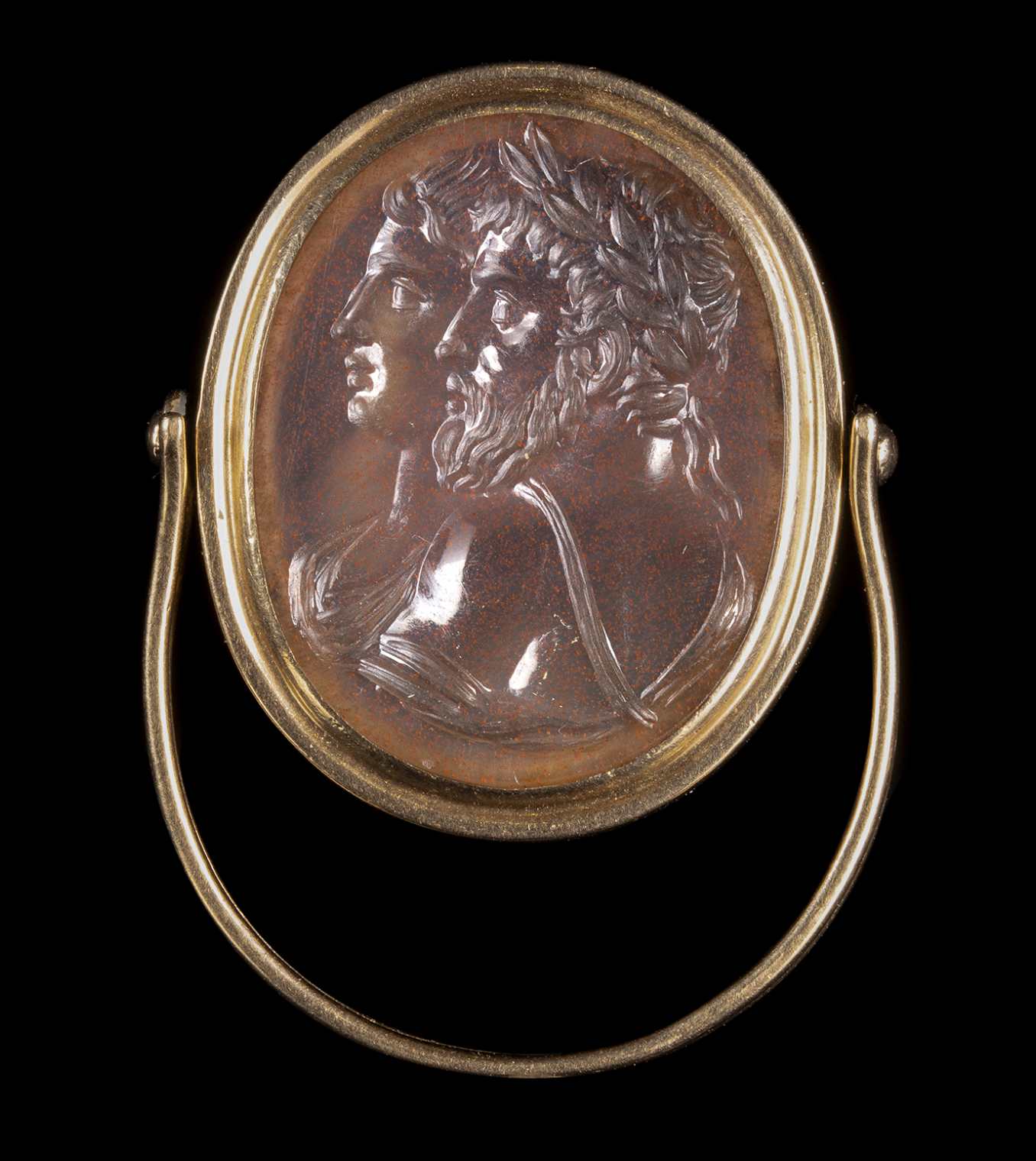 Lotto 357 | A LARGE AGATE INTAGLIO SET IN A SWIVEL GOLD RING. CONJOINED BUSTS OF AN IMPERIAL COUPLE.