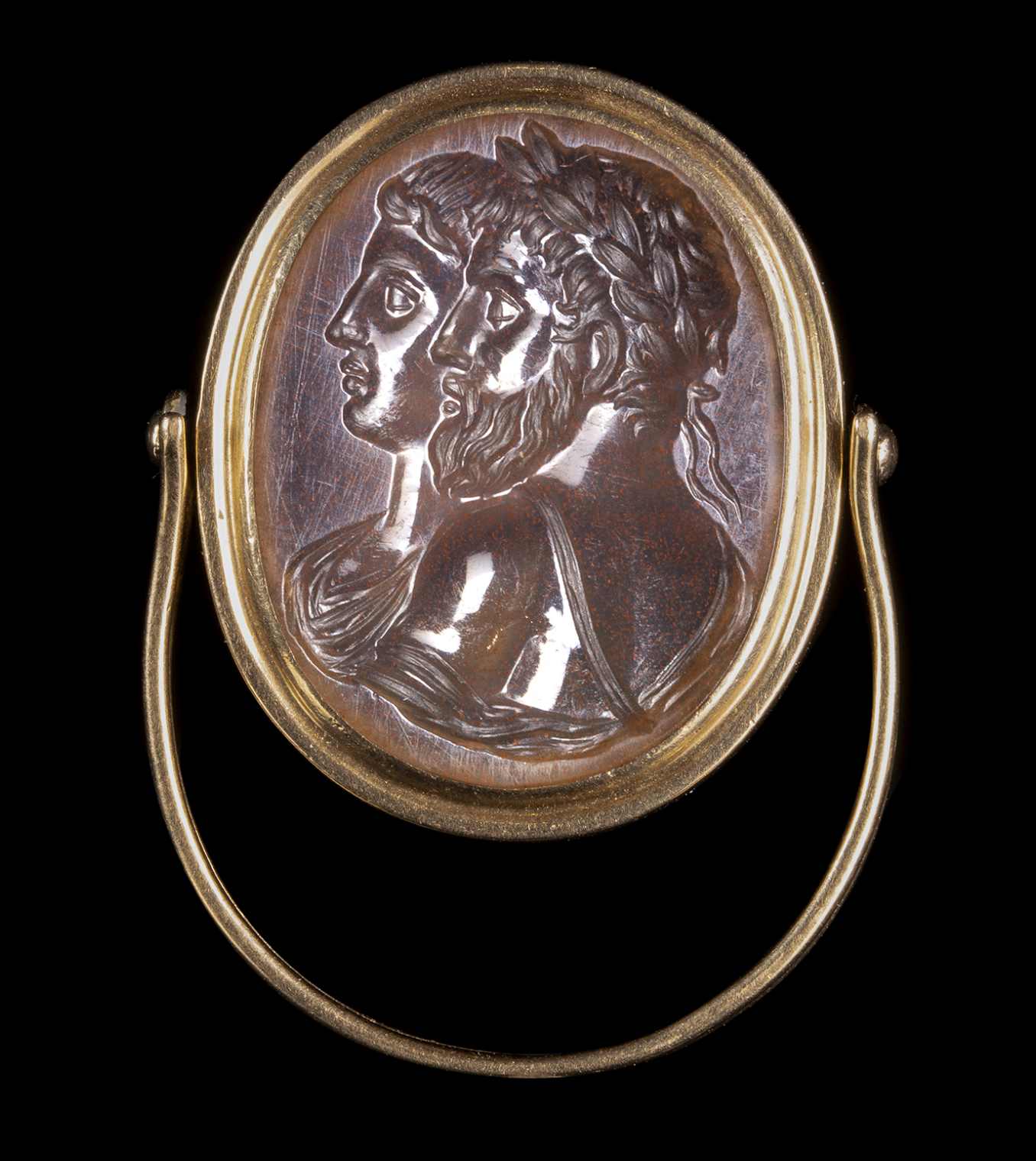 With flatten hoop attached onto the large grooved bezel with screws and set with a large agate intaglio; the portraits are facing left showing a laureated emperor with a long beard and his emperess. The model reminds the effigy of Hercules with Omphale. Mirror polishing. Wear marks.