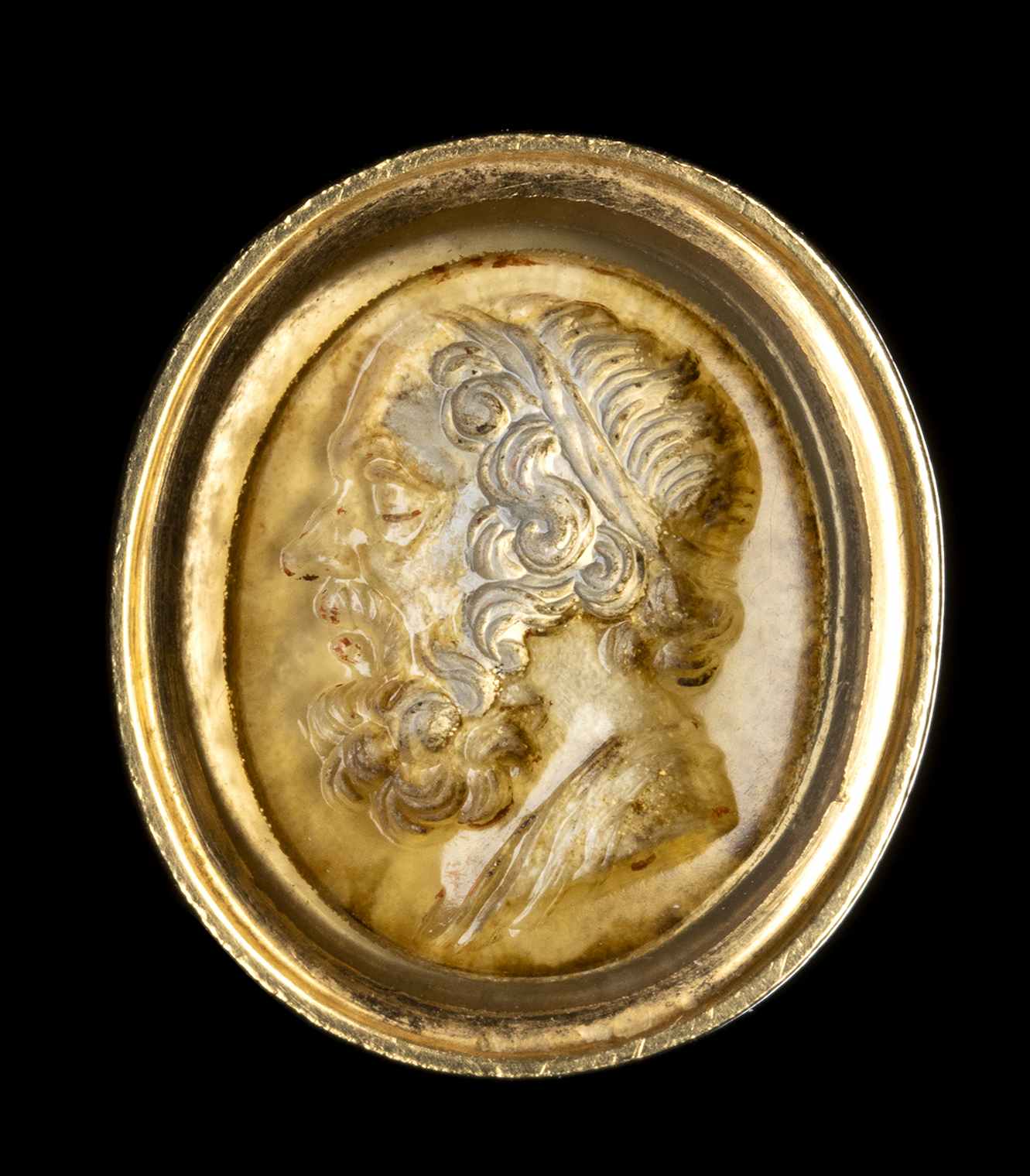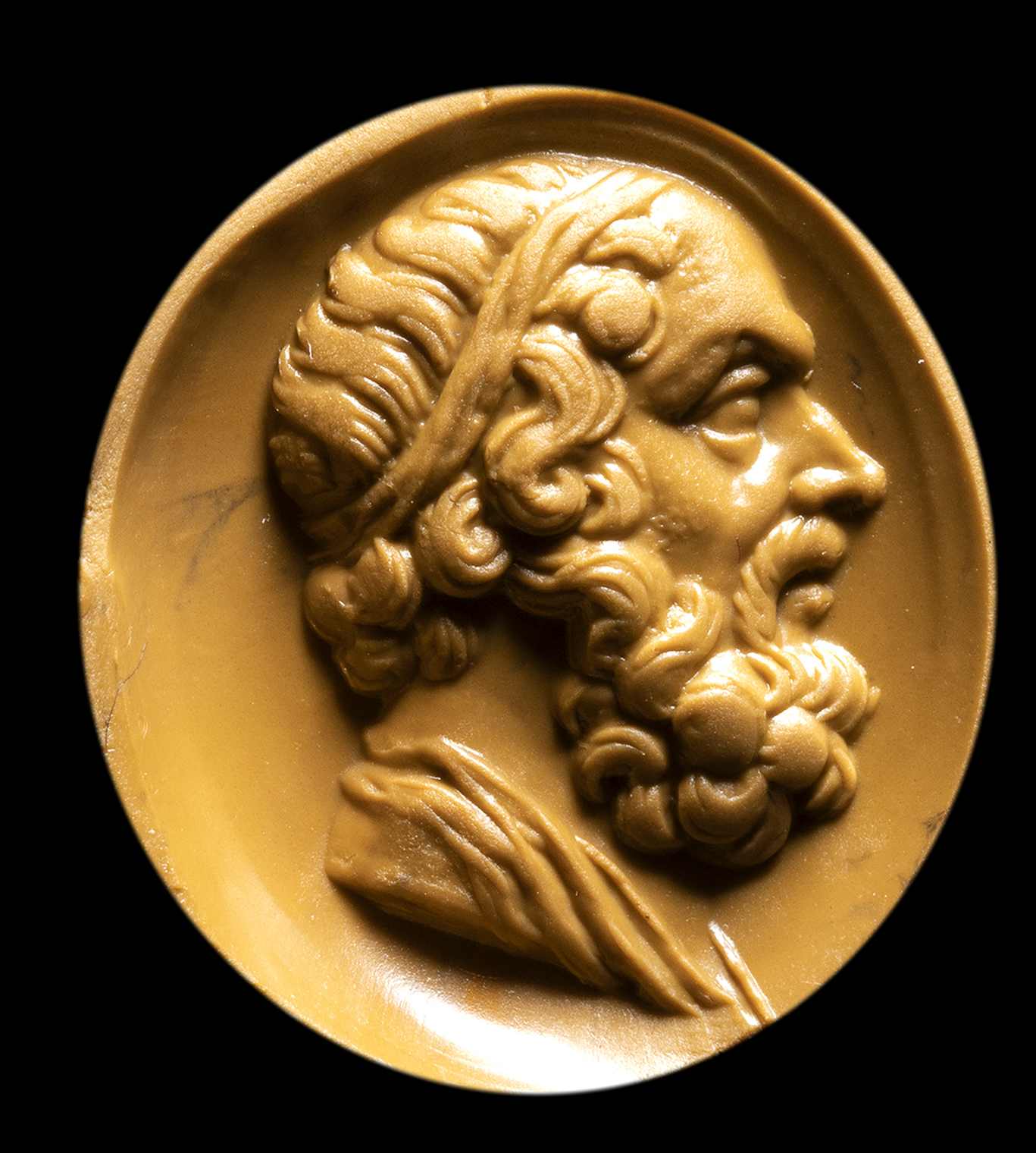 Finely engraved portrait of the Greek poet Homer, facing left. The effigy is characterized by a thick beard and hair held back by a band, the shoulders draped. Interesting and unusual choice of stone.