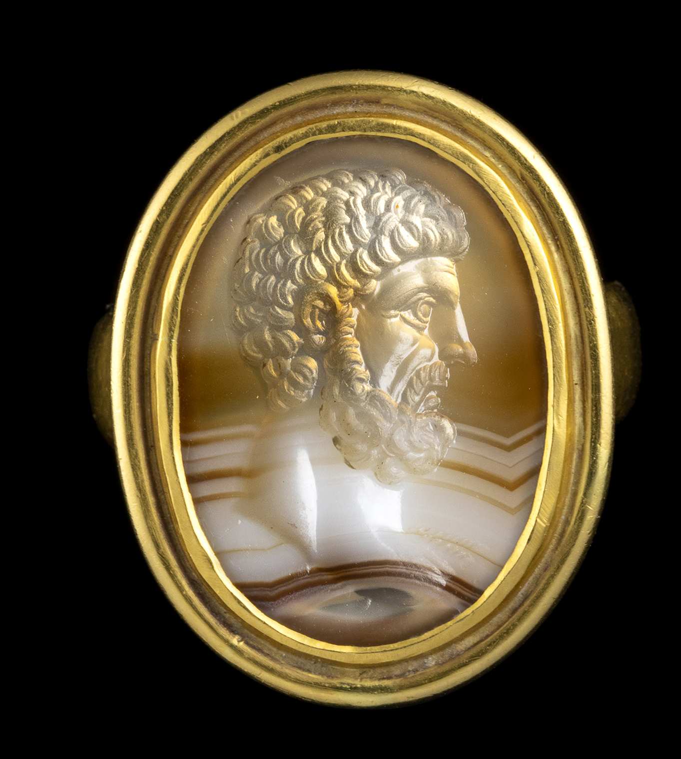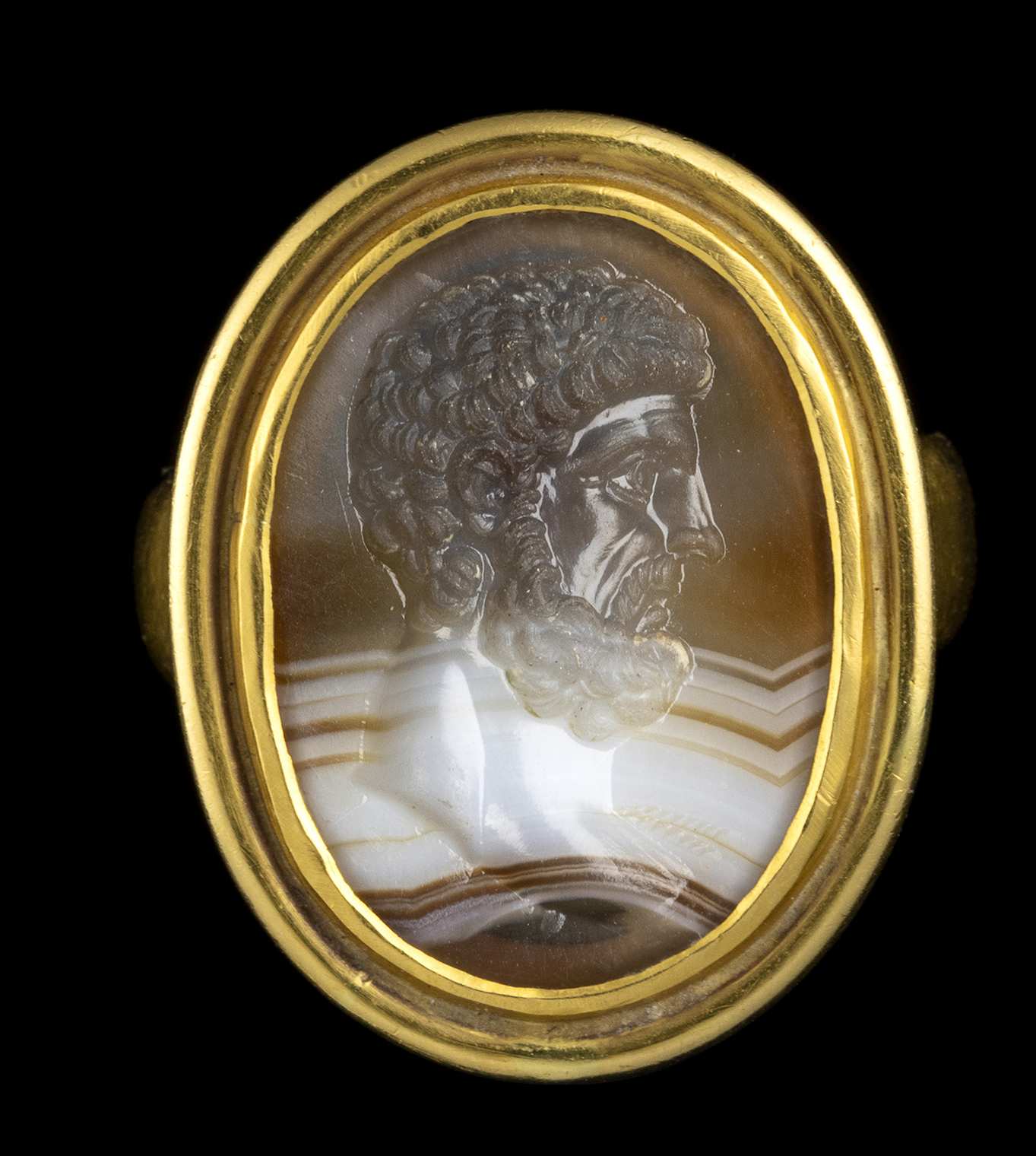 Lotto 360 | A LARGE BANDED AGATE INTAGLIO SET IN A GOLD RING. BUST OF HERCULES.