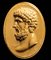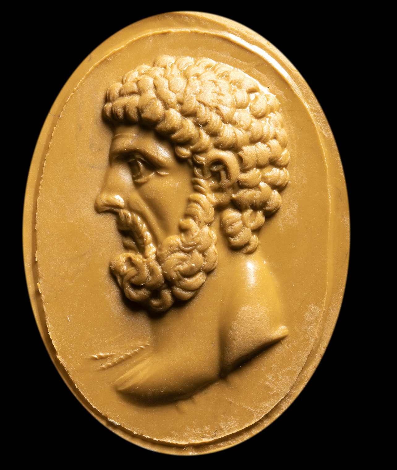 With a massive rounded hoop surmounting a large oval bezel set with a large intaglio depicting Hercules facing right. The Hero is characterized by a strong look, deep features and foliated beard and hair. Large stone.