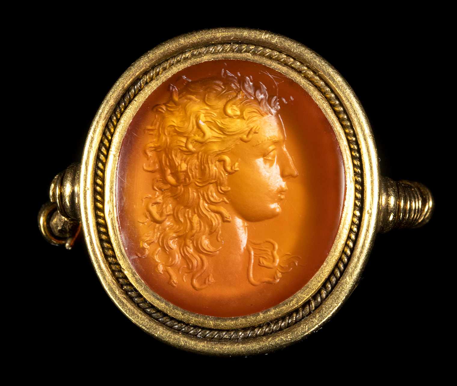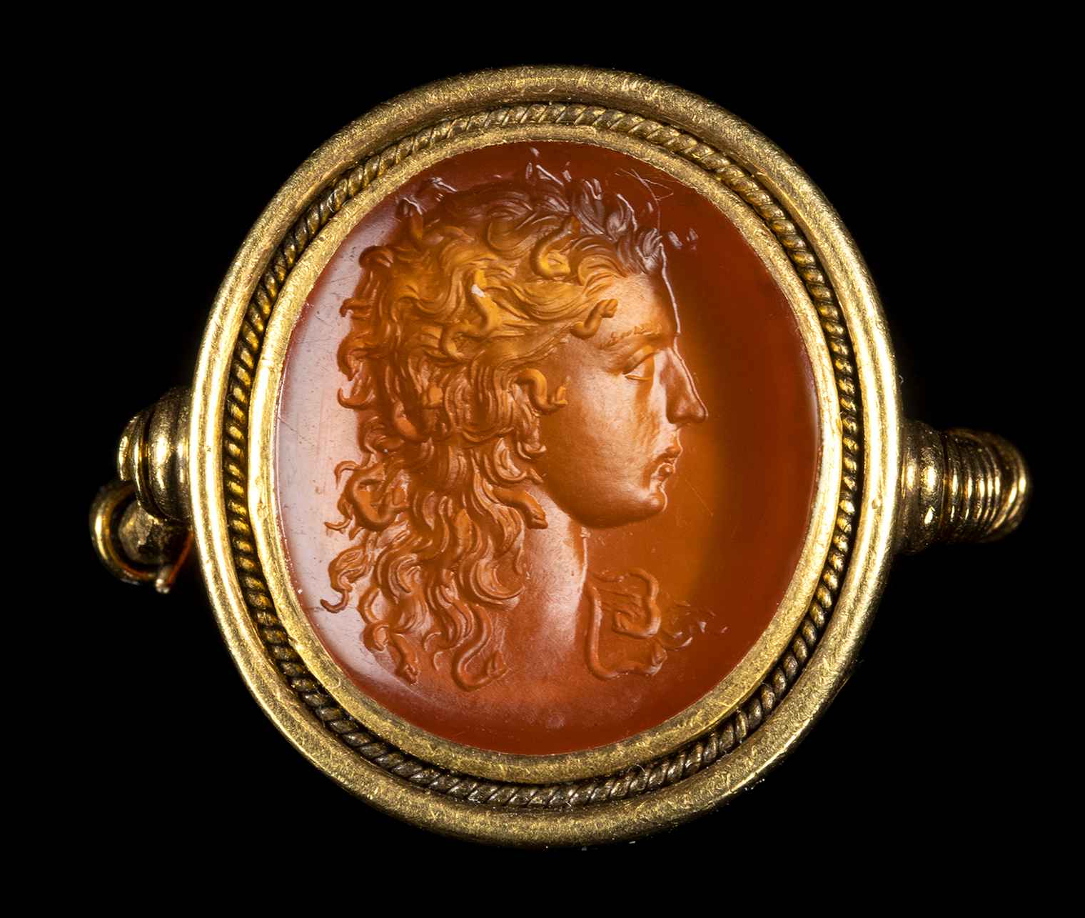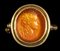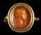 A FINE CARNELIAN INTAGLIO SET IN A GOLD RING. BUST OF MEDUSA.