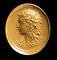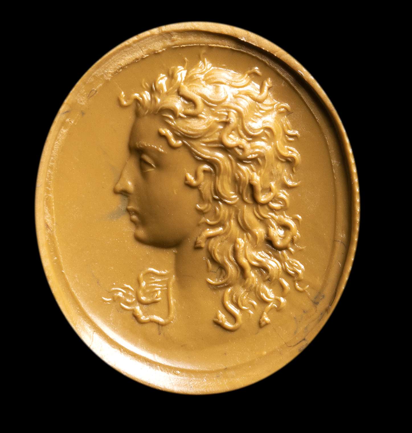 The revival mounting is characterized by shoulders with intertwined gold wired and a large rounded grooved box setting with a twisted gold wire; portrait of Medusa facing right. The mythological figure is characterized by elegant long wavy hair made of snakes with open mouths. With young features, long nose, small slightly open mouth and proturding chin. The eye wide open. Wear marks.
