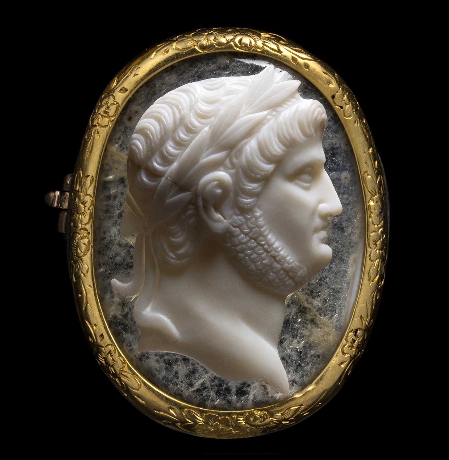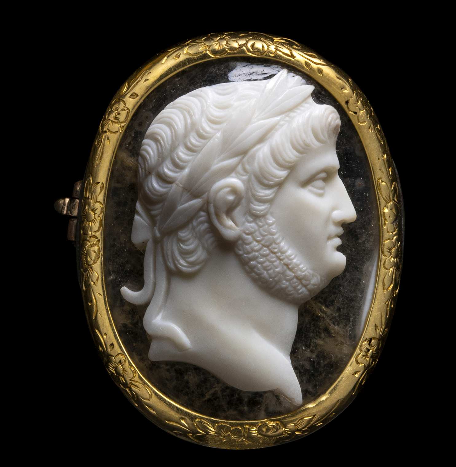 A FINE NEOCLASSICAL AGATE CAMEO SET IN A GOLD BROOCH. PORTRAIT OF THE EMPEROR NERO.