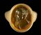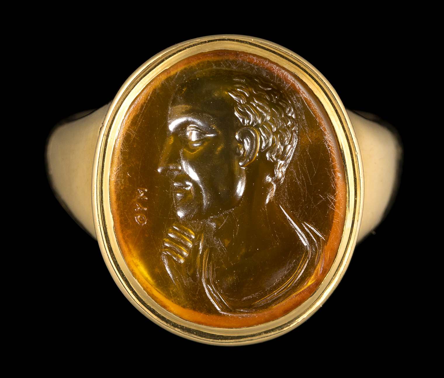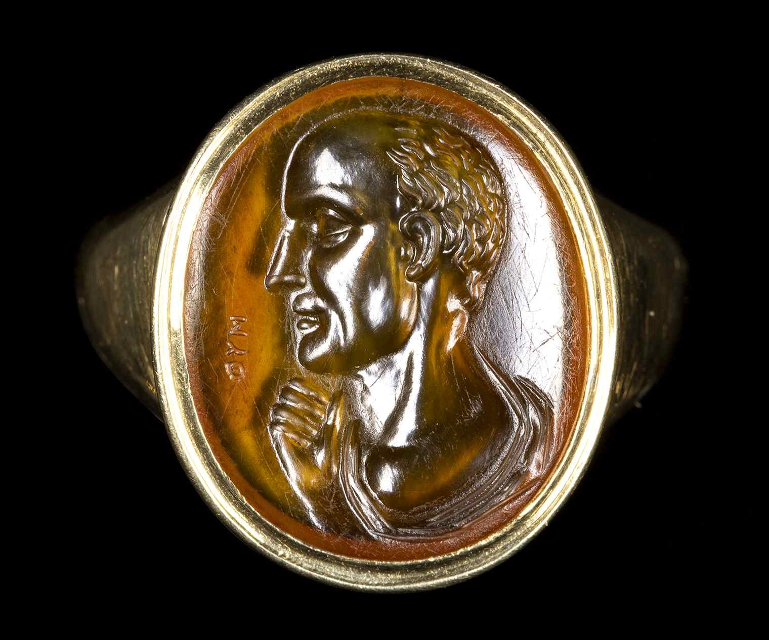 A NEOCLASSICAL AGATE INTAGLIO SET IN A MODERN GOLD RING. BUST OF JULIUS CAESAR.
