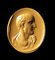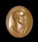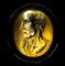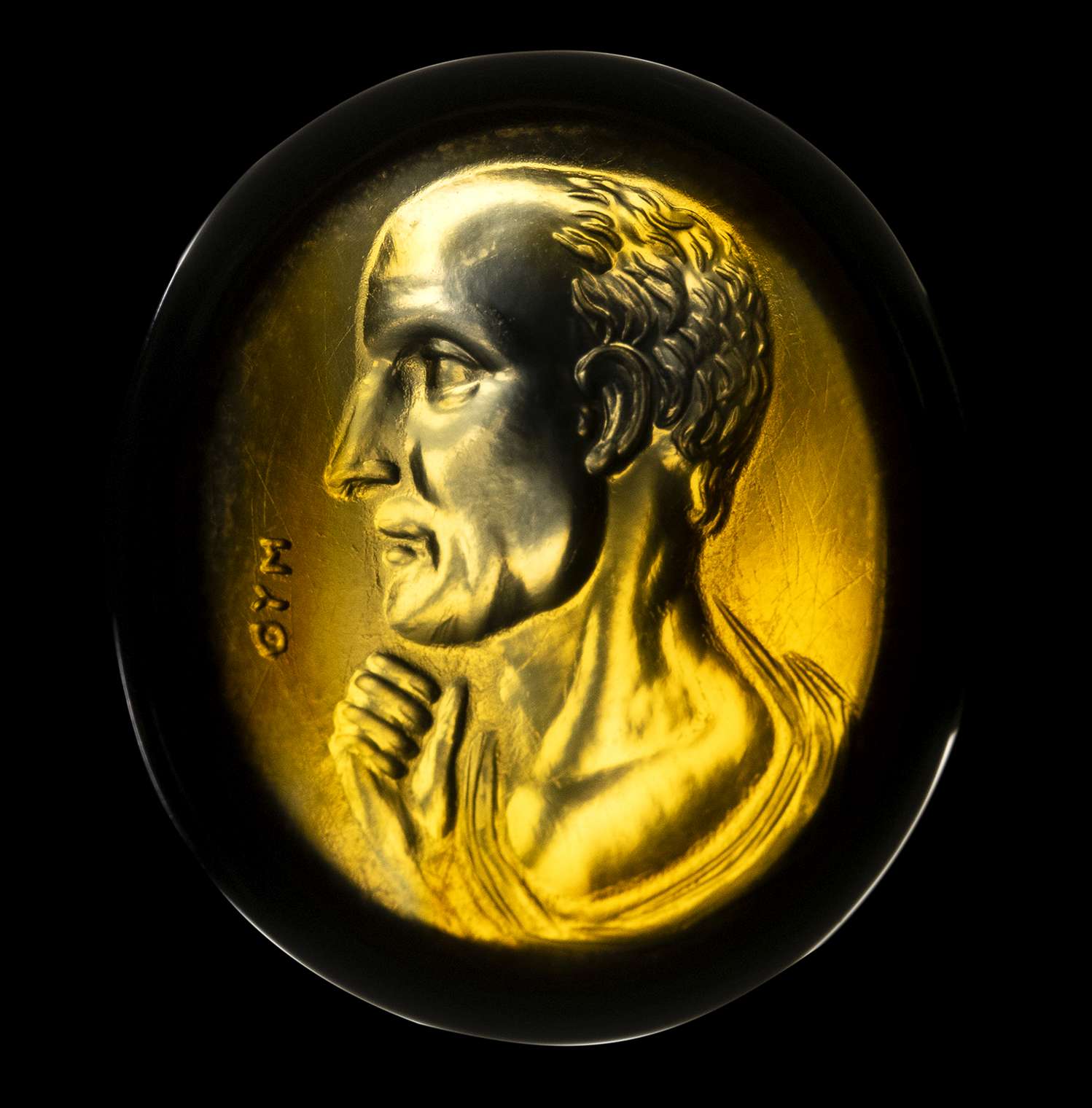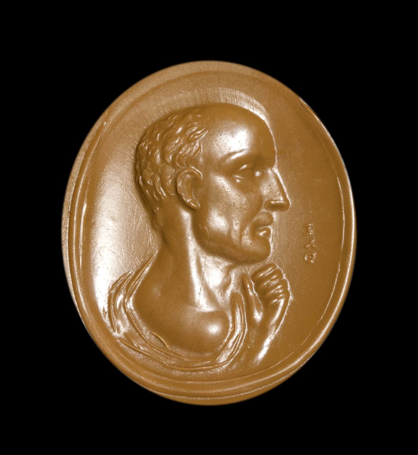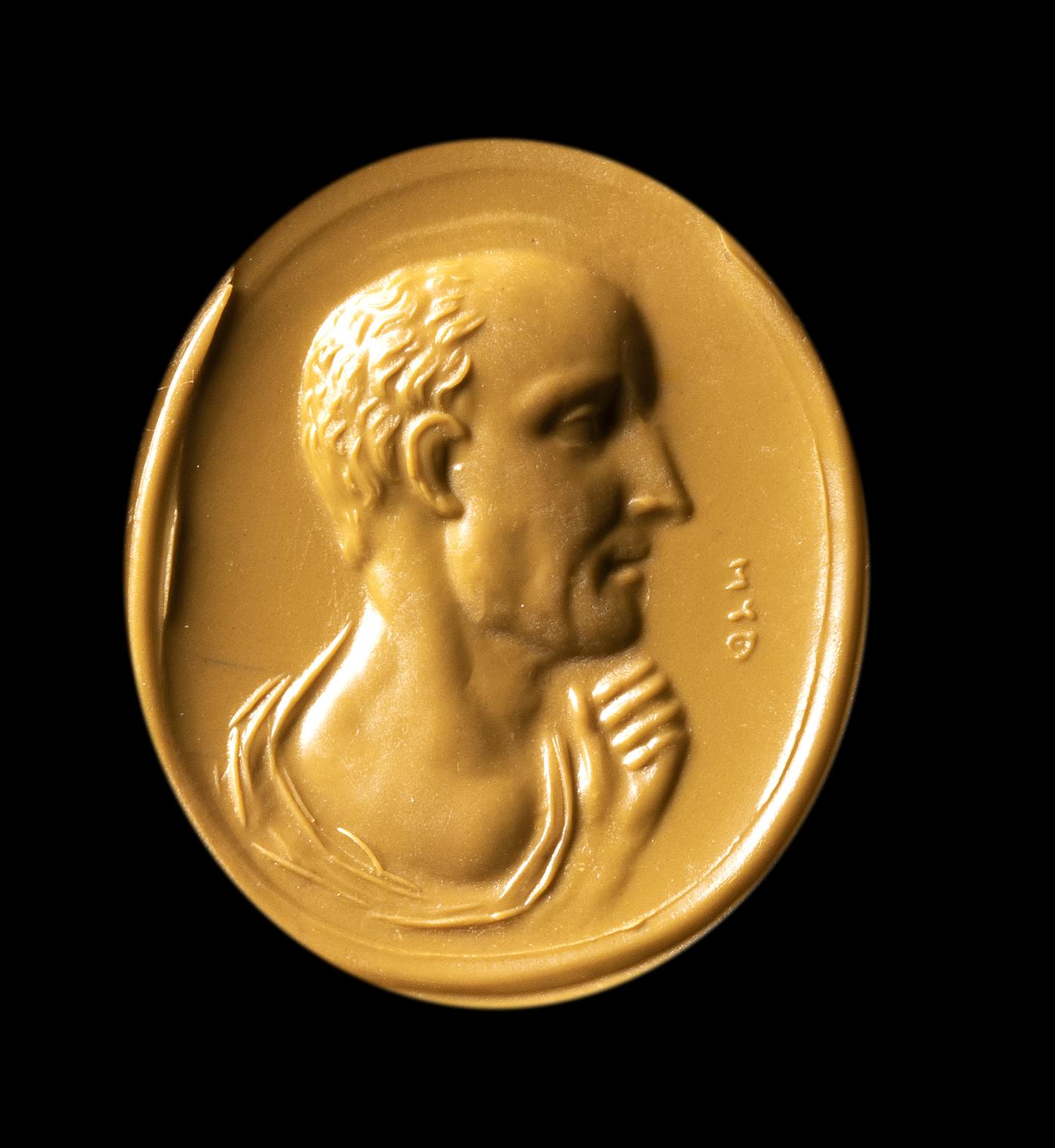 Bust of a beardless man, partially bald, with a haggard face, and a long thick neck, in profile to the left. Round is prominent left shoulder is draped a mantle, a fold of which he gasps in his right hand. The head resembles Julius Caesar. The absence of the usual attributes make the identification uncertain. There are many replicas of this type. The model have to be identified in the fine amethyst intaglio in the Metropolitan Museum (NY). In the field, three greek letters for MYO (to be identified). Wear marks.