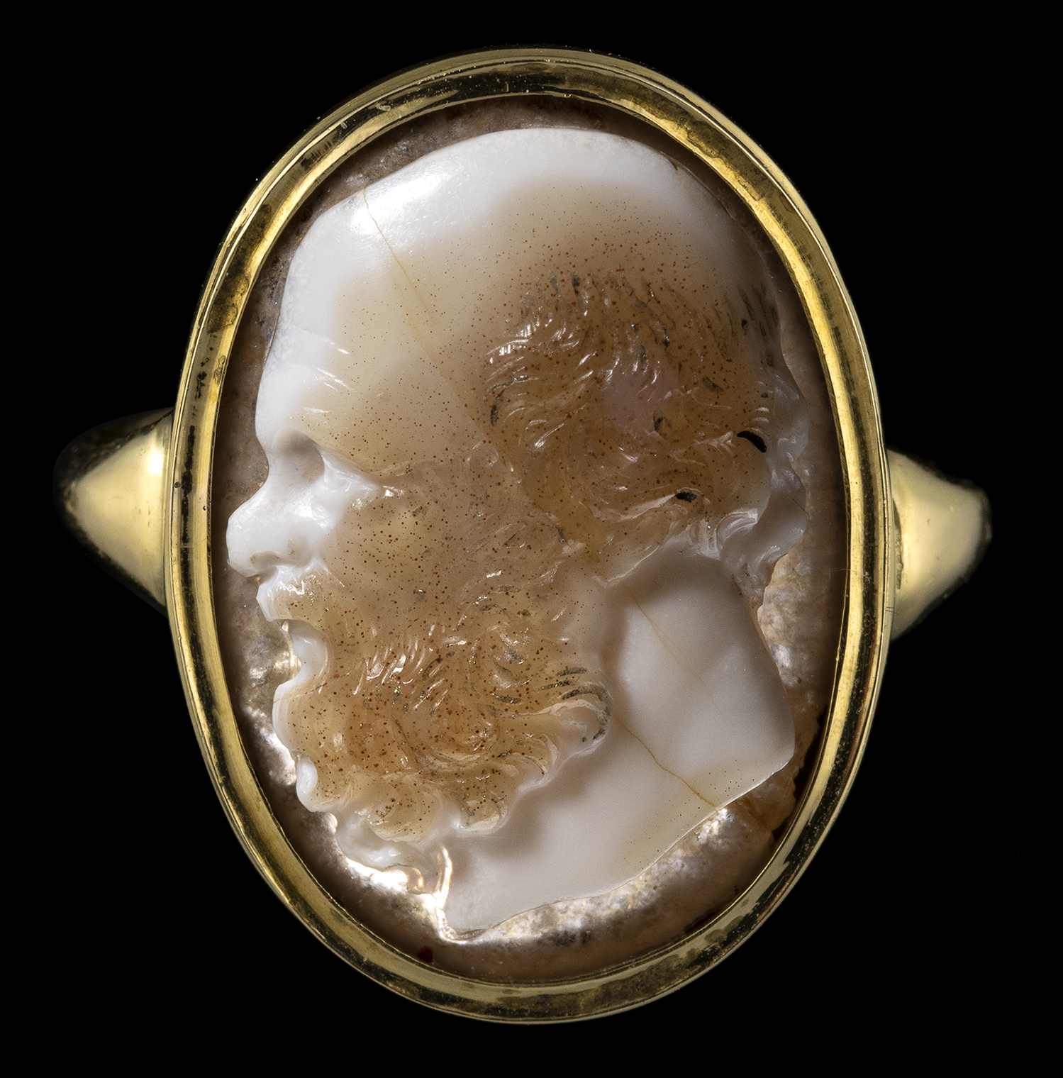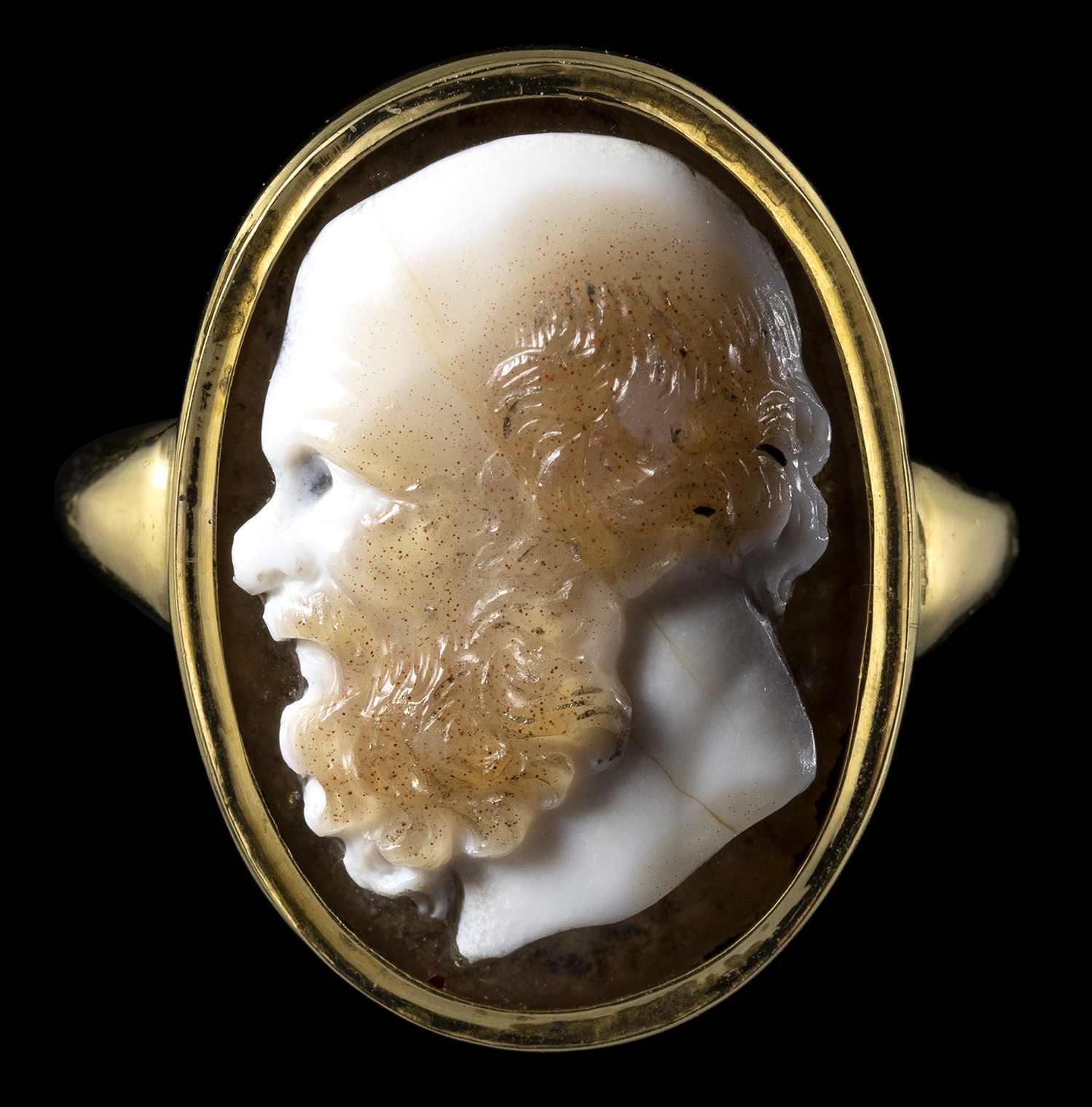 A fine portrait of the Greek philosopher, facing left. The head is characterized by a partially bald skull with thick hair on the nape, a long beard, short and rounded nose, deep-set eyes with a meditative expression. The effigy is engraved on a three-layer agate with a crystallized background. Two slight diagonal cracks affecting only the surface. The stone is solid set in a later gold ring.