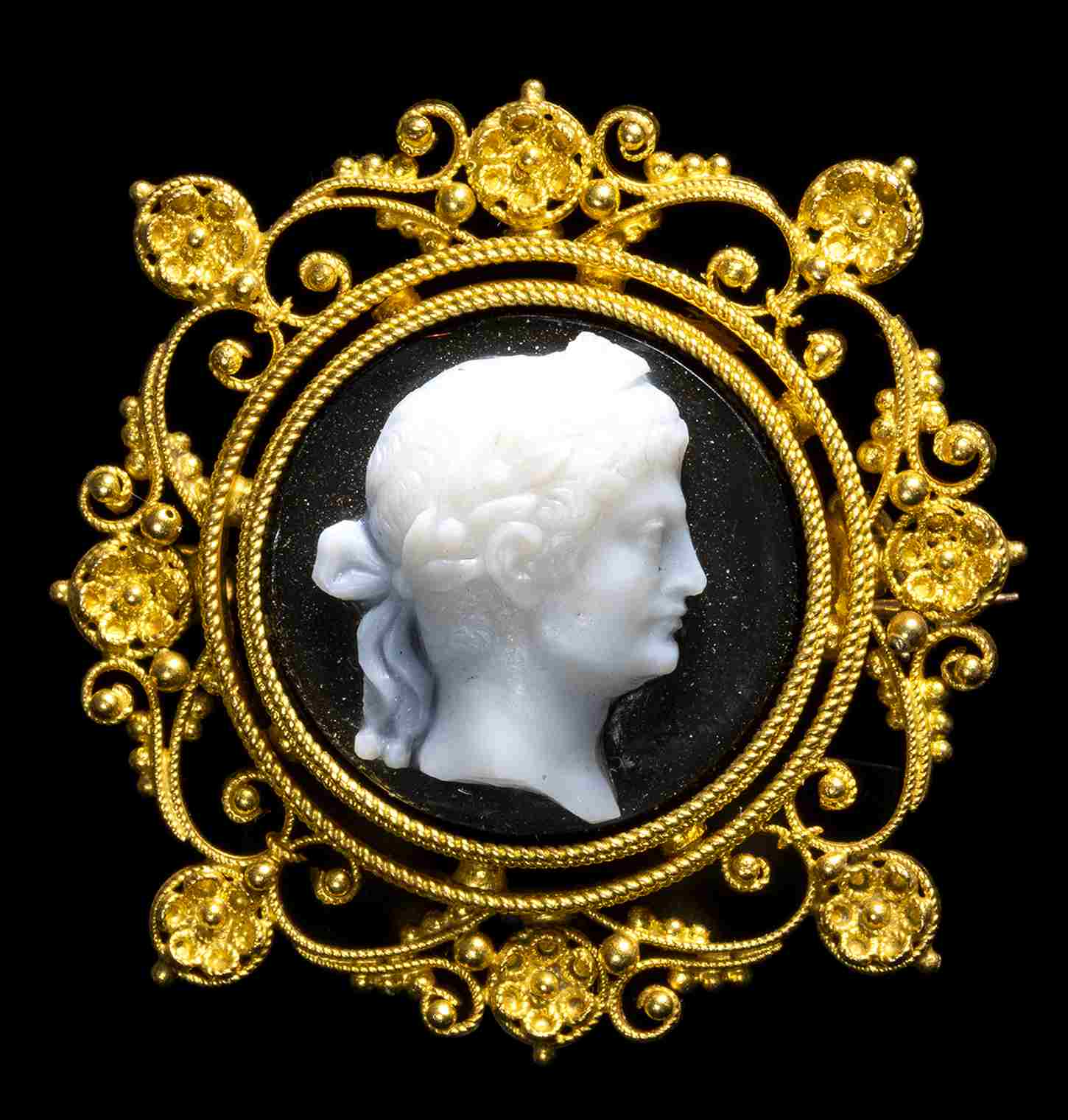 Beautiful effigy of a young laureated emperor inspired by the portraits of the Julio-Claudian dynasty. The cameo is circular and mounted in a refined gold brooch with floral patterns enriched by small spherical and intertwined elements of different sizes.