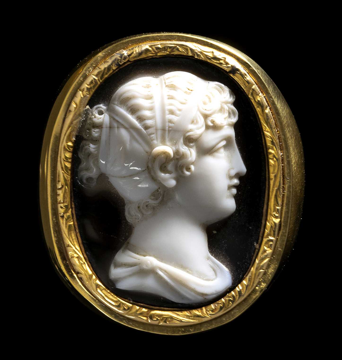 A NEOCLASSICAL ONYX CAMEO SET IN A GOLD RING. BUST OF SAPPHO.