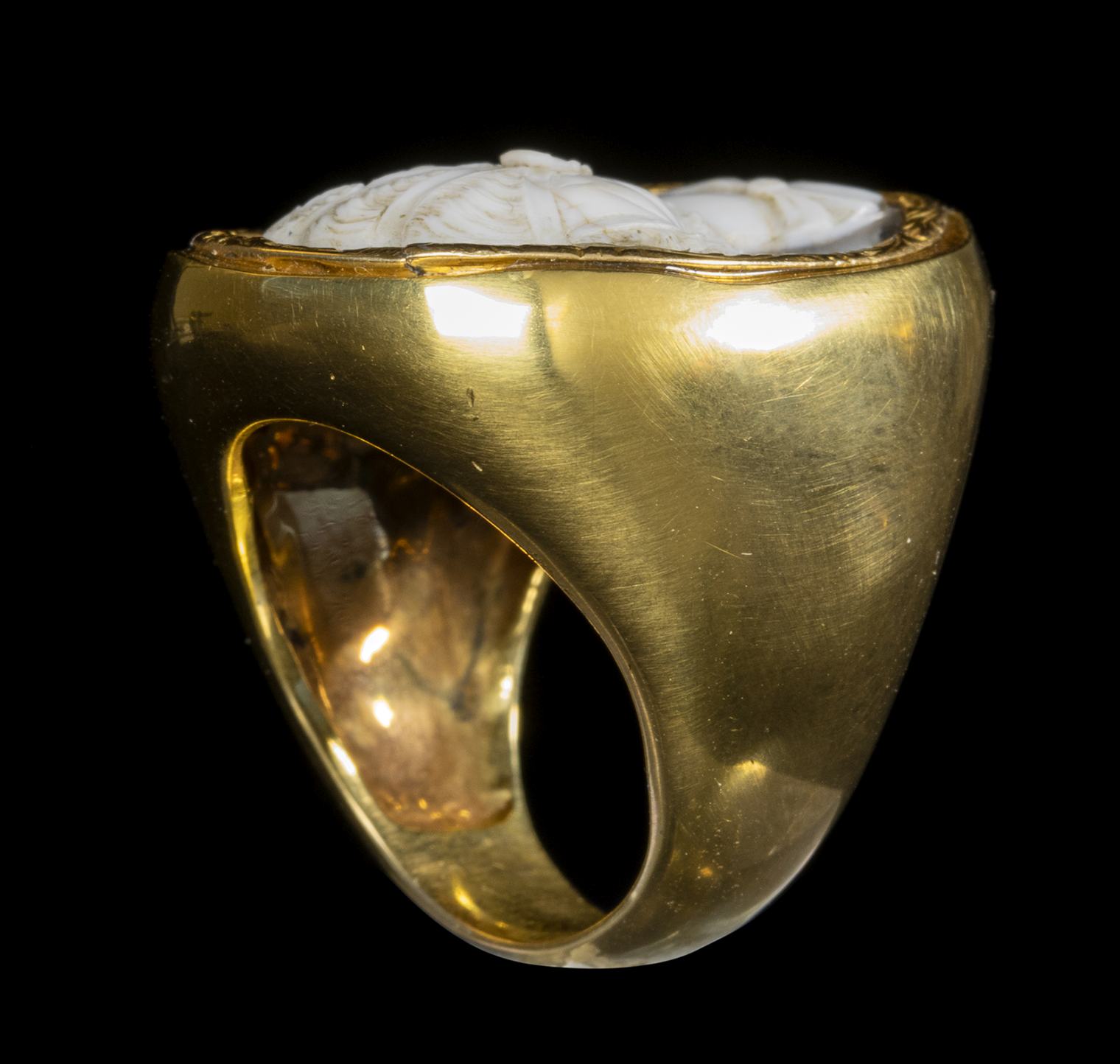 This beautiful effigy faces right and is characterized by hair held by three bands and a sort of sakkos on the nape of the neck, which however makes the hair come out at the top. The portrait is very similar to a sardonyx cameo depicting the bust of the poetess Sappho signed by N. Amastini (Wartski) . The cameo has small missing (ear and hair) and light superficial cracks. The stone is set in a solid gold ring with a finely chiseled setting.