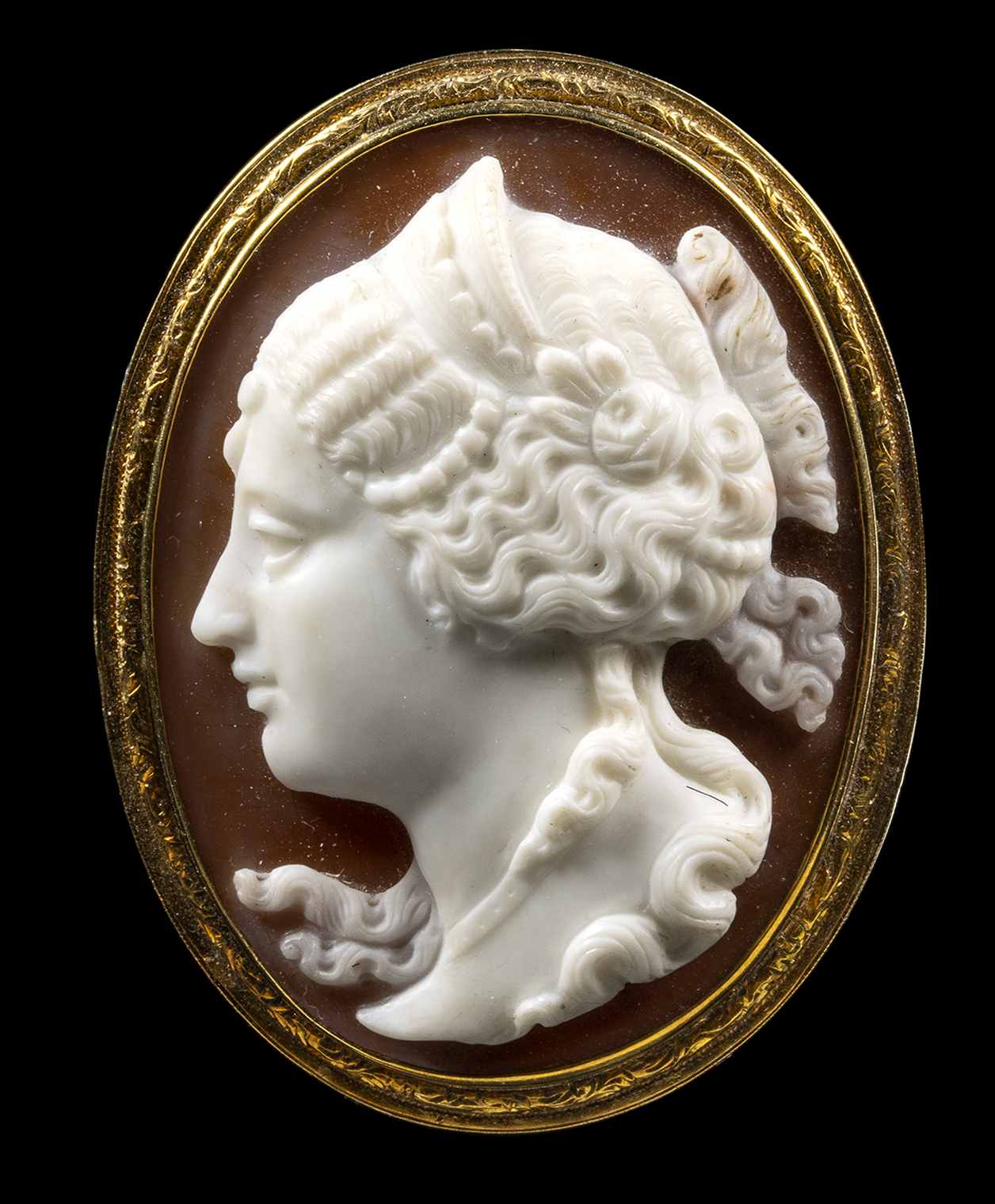 A NEOCLASSICAL CISELED GOLD BROOCH SET WITH A LARGE TWO-LAYERED AGATE CAMEO. DIADEMED PORTRAIT.