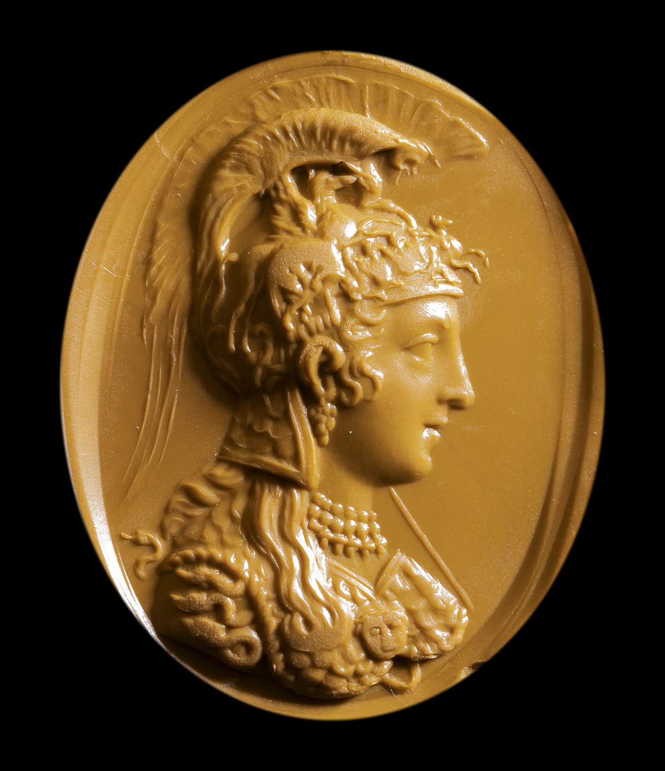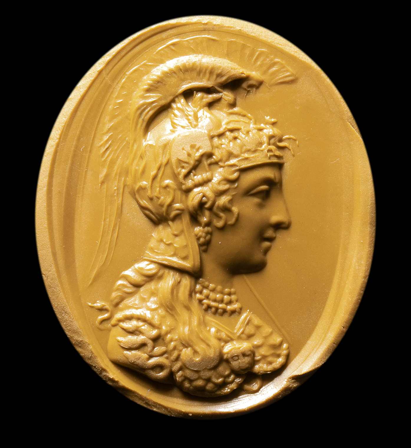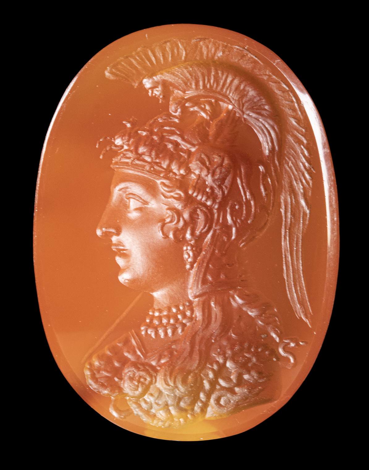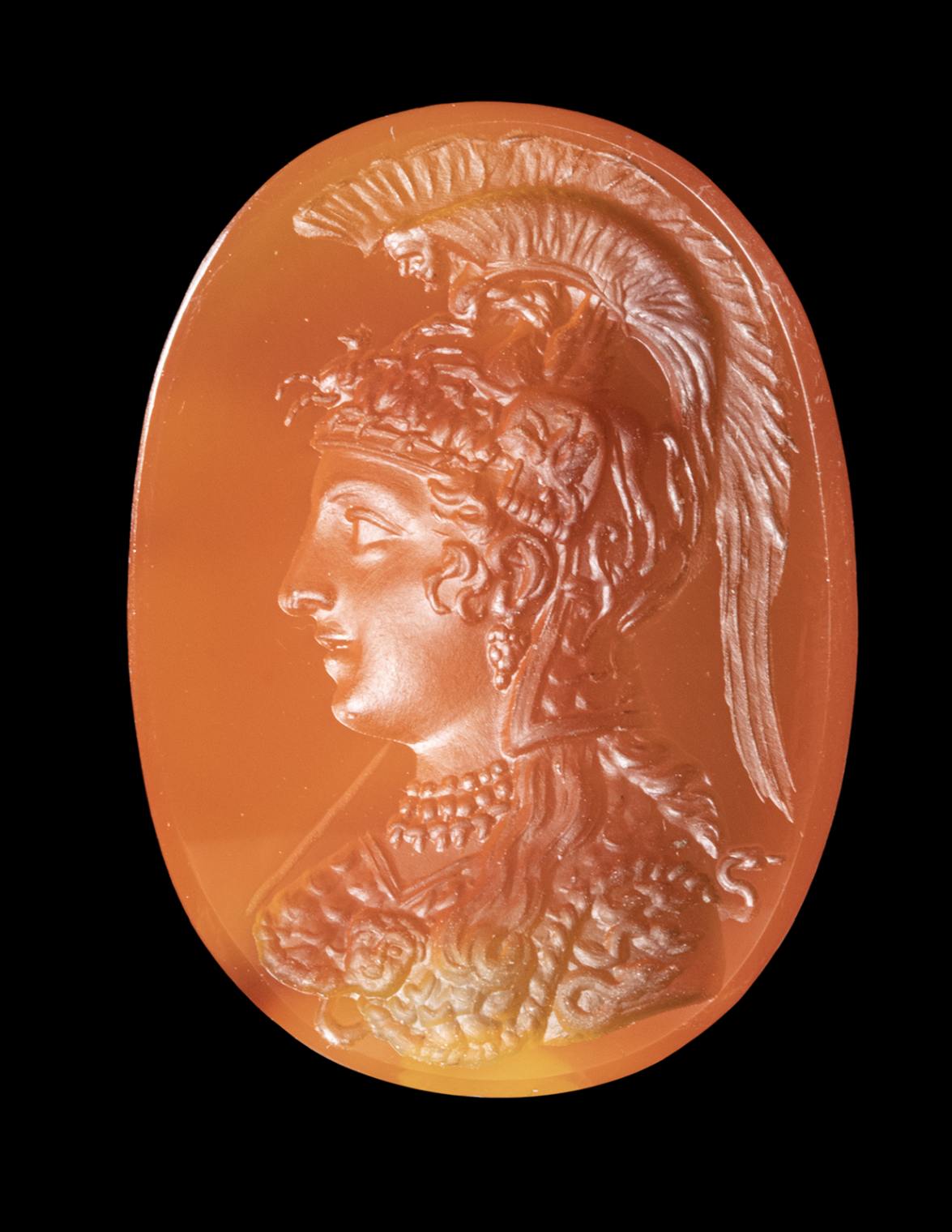 This beautiful bust is engraved after a famous Roman red jasper intaglio signed by Aspasios (Museo Nazionale Romano, Rome). The depiction of the helmet and the armour are highly detailed.