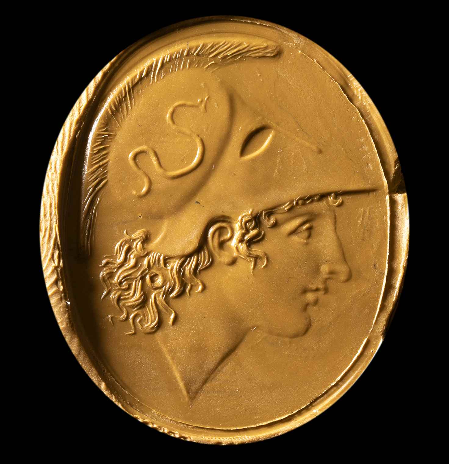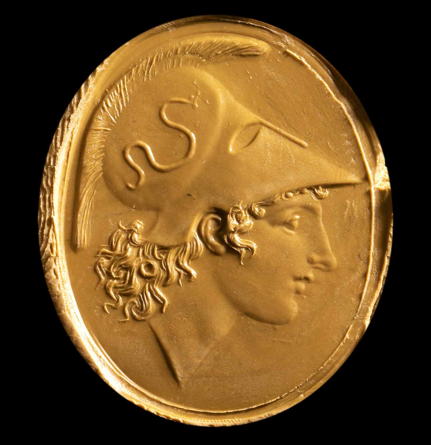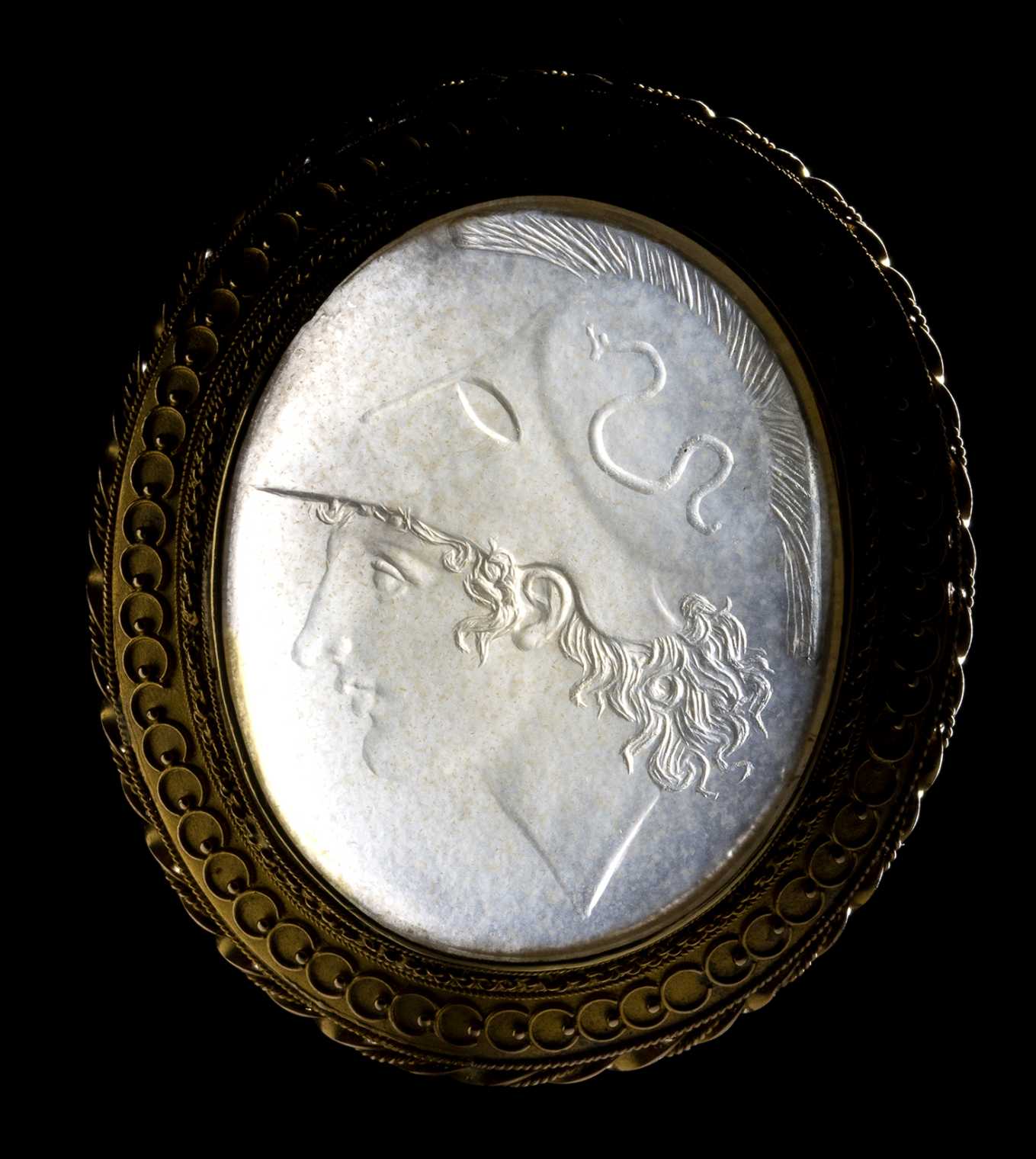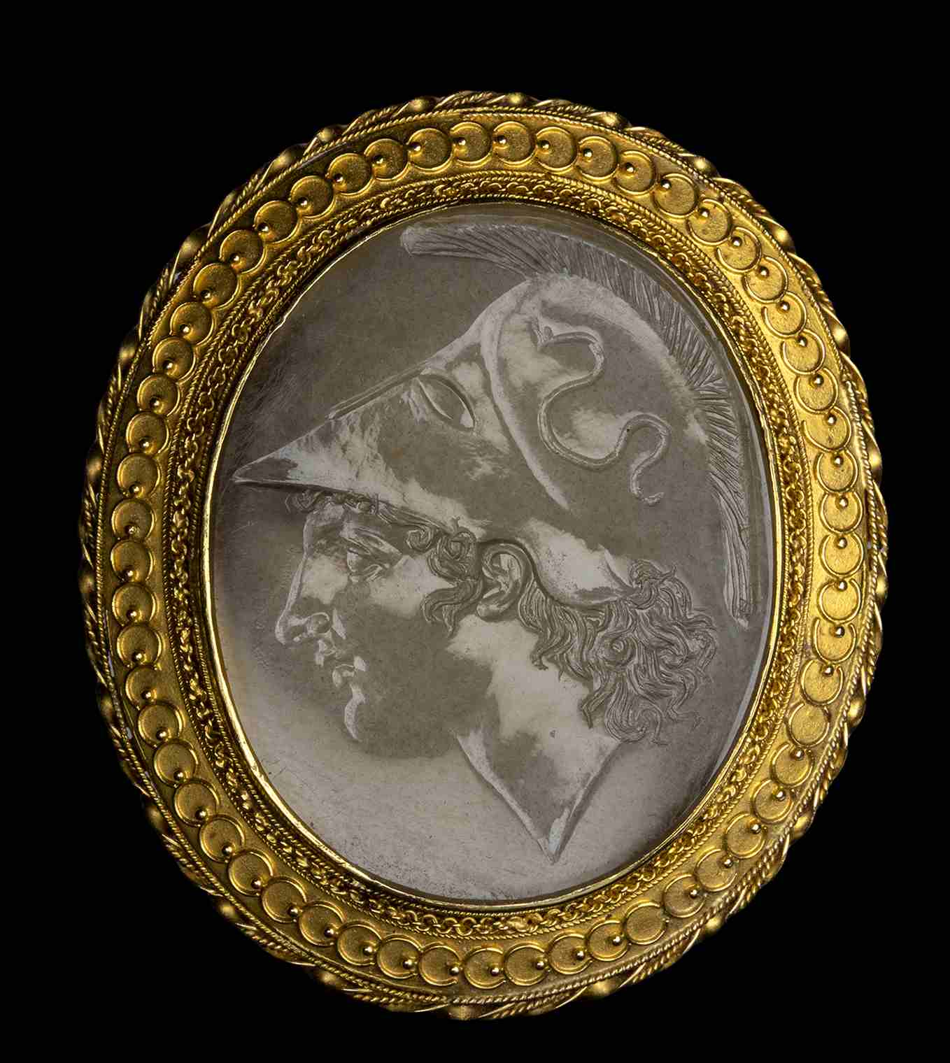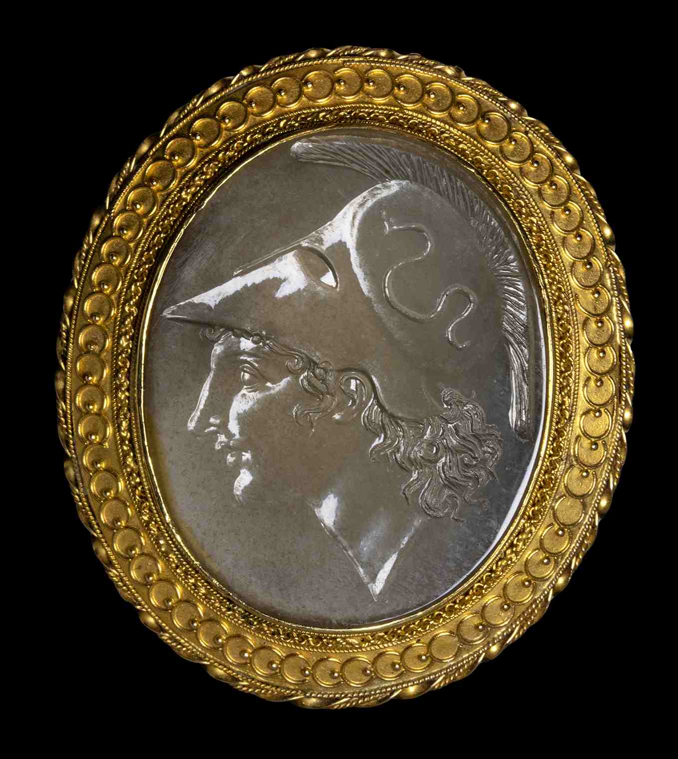 The helmeted head is facing left, the features are probably referable to Achilles. The style and the carving technic remind the work of Filippo Rega (1761-1833). Also Luigi Pichler and Giuseppe Cerbera copied Rega's depiction of Greek classical hero and rulers portraits. This intaglio is characterized by a very thin incision. Beautiful archaeological revival brooch.