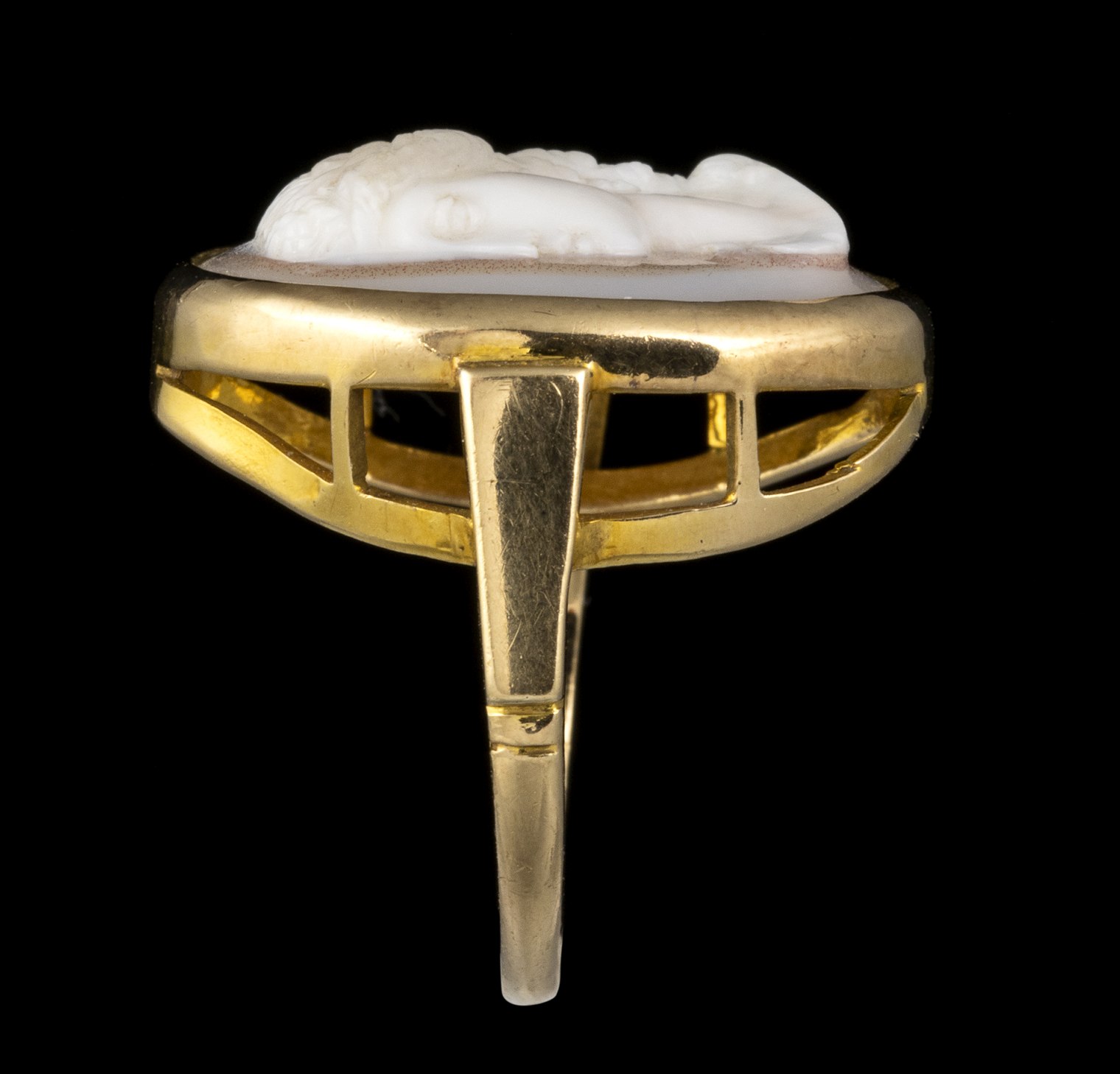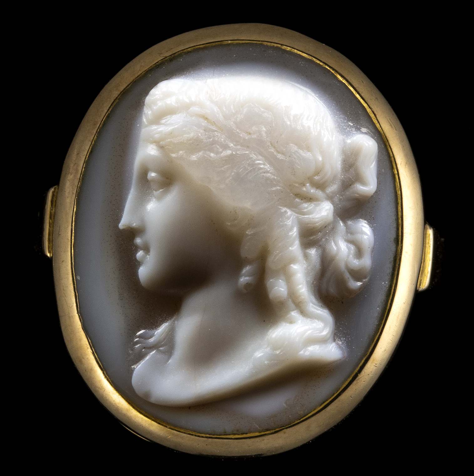 A NEOCLASSICAL SIGNED AGATE CAMEO SET IN A GOLD RING. BUST OF ARIADNE.