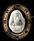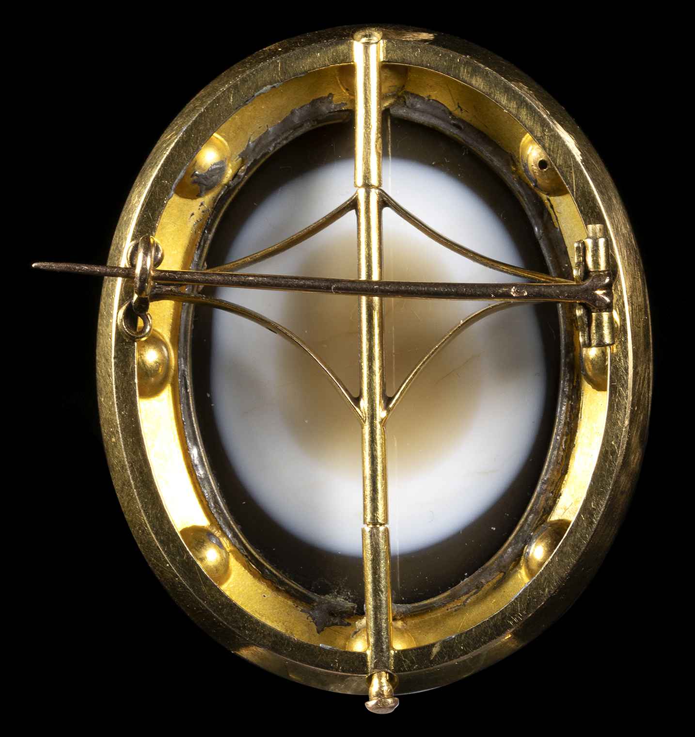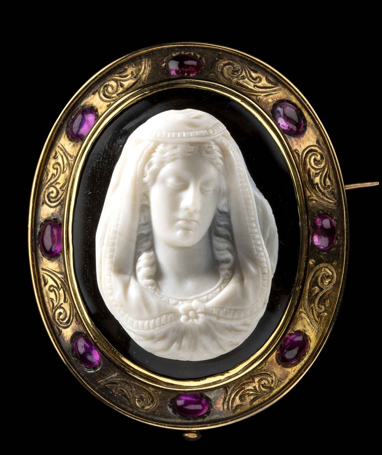 The bust is facing front, the head slighlty turned is characterized by soft features; close almond shaped eyes, straight nose small full lips and rounded chin. The long wavy hair are separated in the middle of the front and partially covered by a delicate embroided veil attached in the center of the bust by a floral brooch. The composition and the iconography are referrable to a depiction of the Virgin Mary. Probably French or Italian work. The cameo is set in a large beautiful ciseled gold brooch with 8 treated rubelite cabochons.