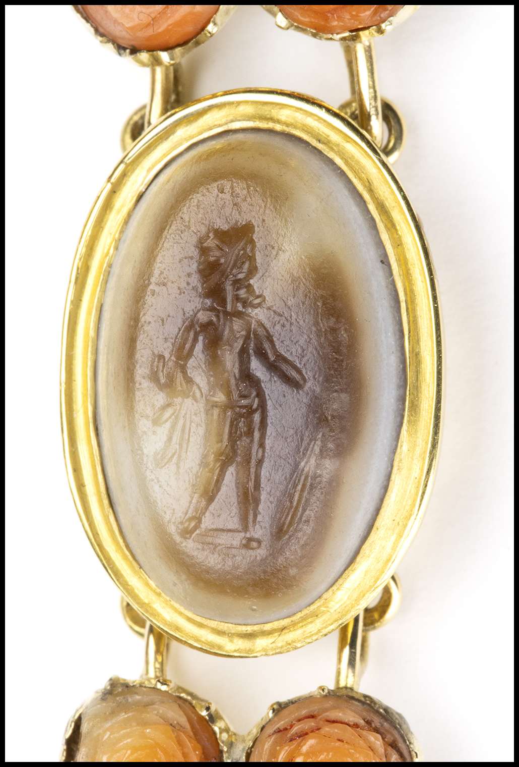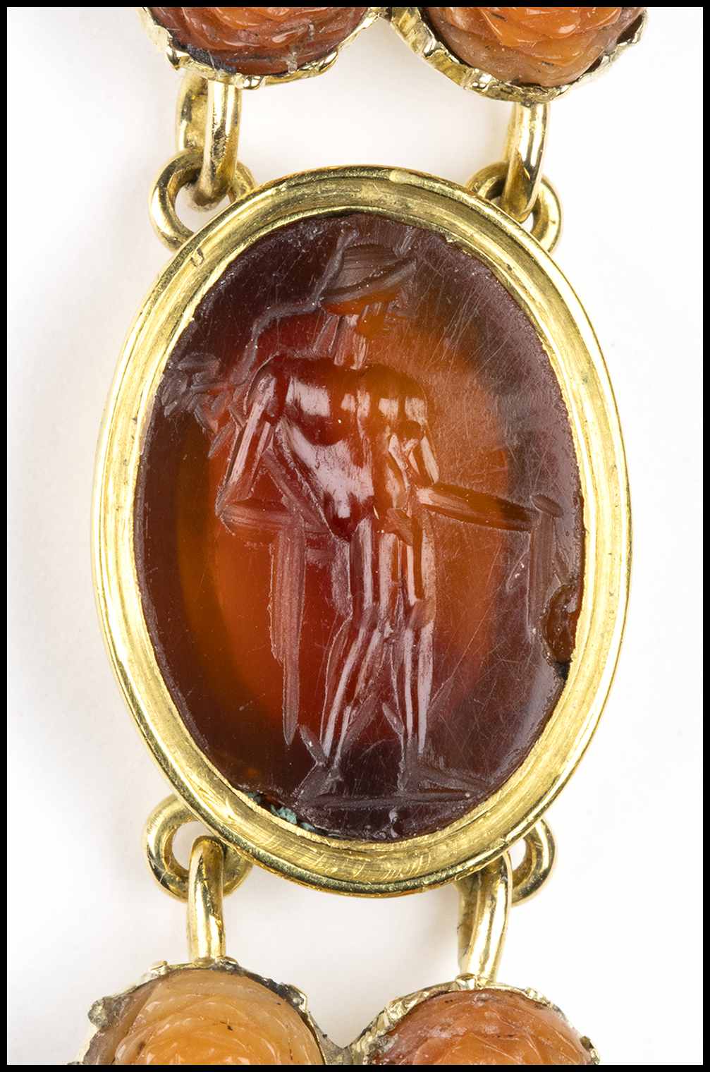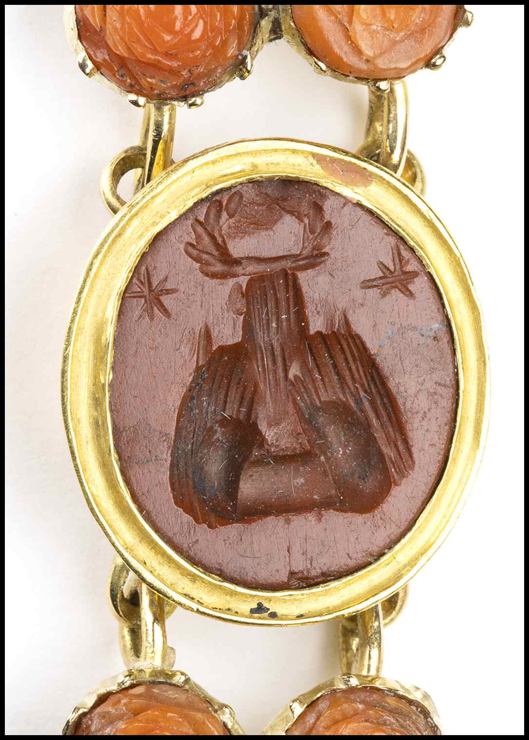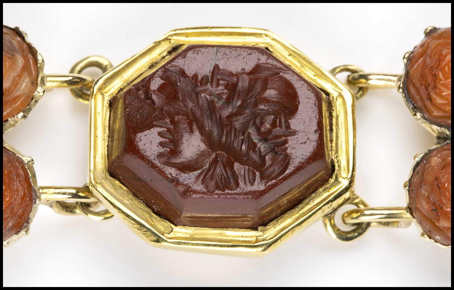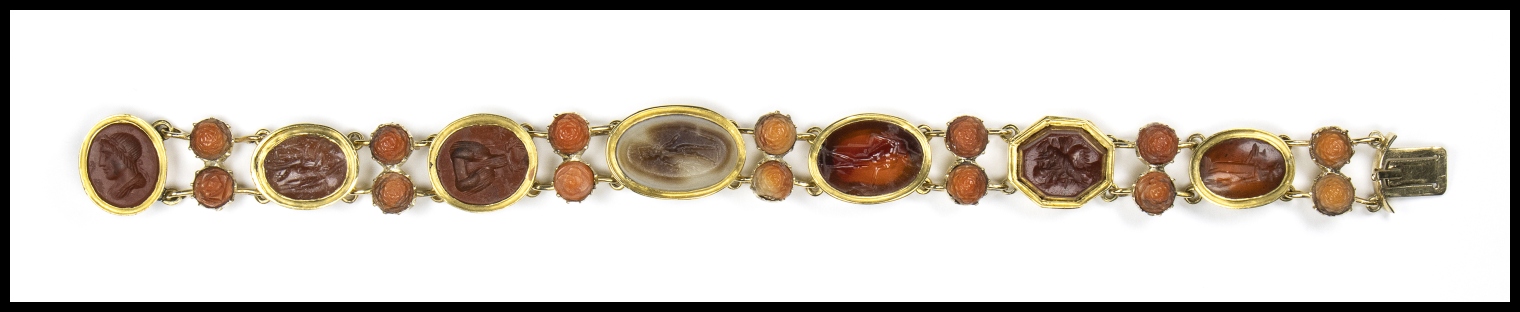 A VICTORIAN GOLD BRACELET WITH SEVEN ROMAN HARDSTONES INTAGLIOS AND CORAL ROSES. VARIOUS SUBJECTS.