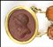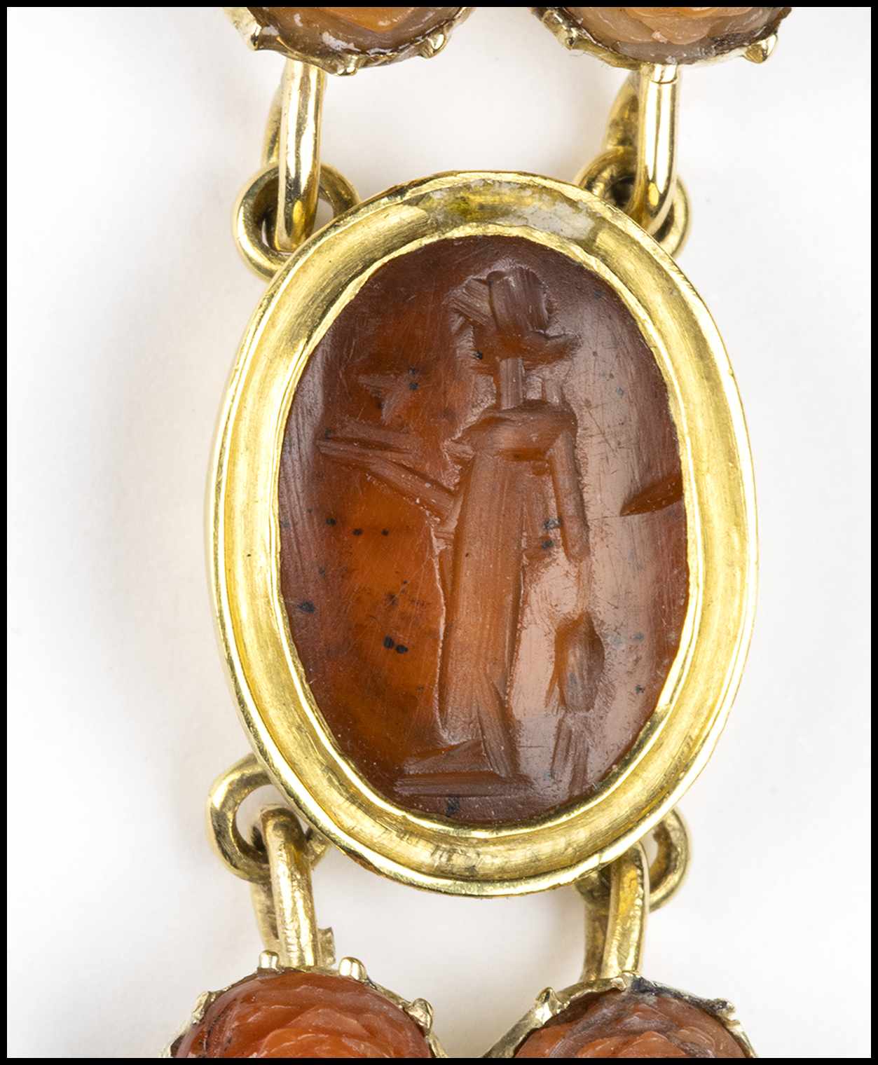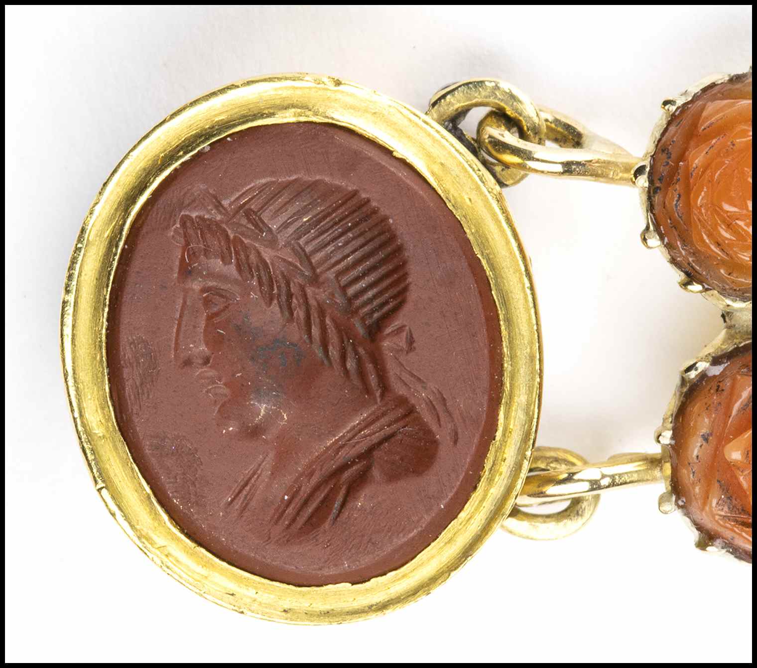 From left to right: red jasper intaglio with a laureated male bust; a burnt agate intaglio with winged Nike; red jasper intaglio with Mount Argaios, two stars and laurel wreath; three layers agate intaglio with standing Hercules holding the club; carnelian intaglio with Hermes; red jasper intaglio with a Gryllos; carnelian intaglio with Offerer. Wear marks. Each intaglio is set in a gold box-setting linked by a double chain ornamented by two coral roses cameos.