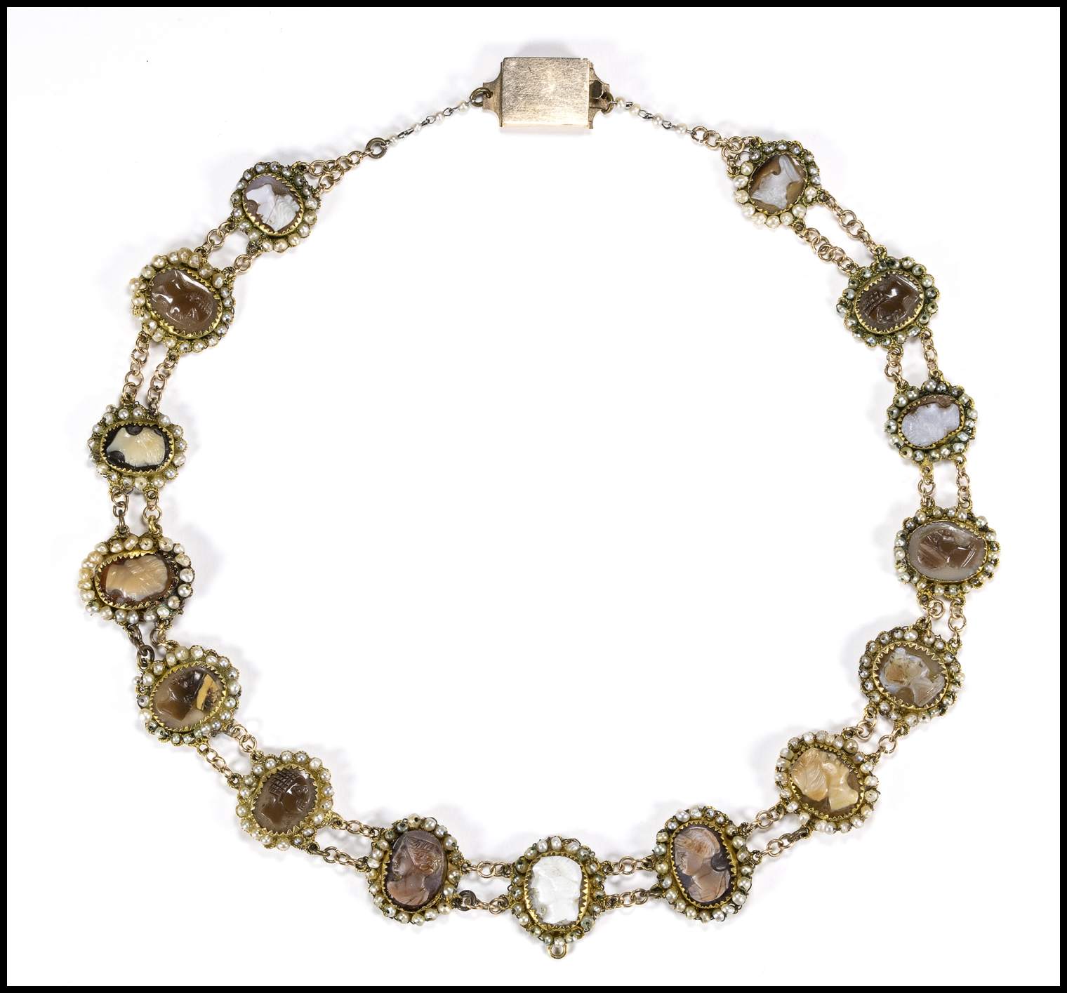 Composed of a double gold chain set with 15 box settings adorned with pearls and agate cameos depicting portraits, among them, Moores heads, noblemen and women.