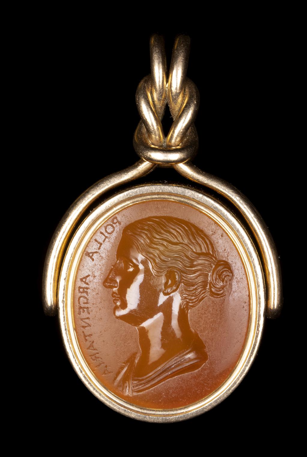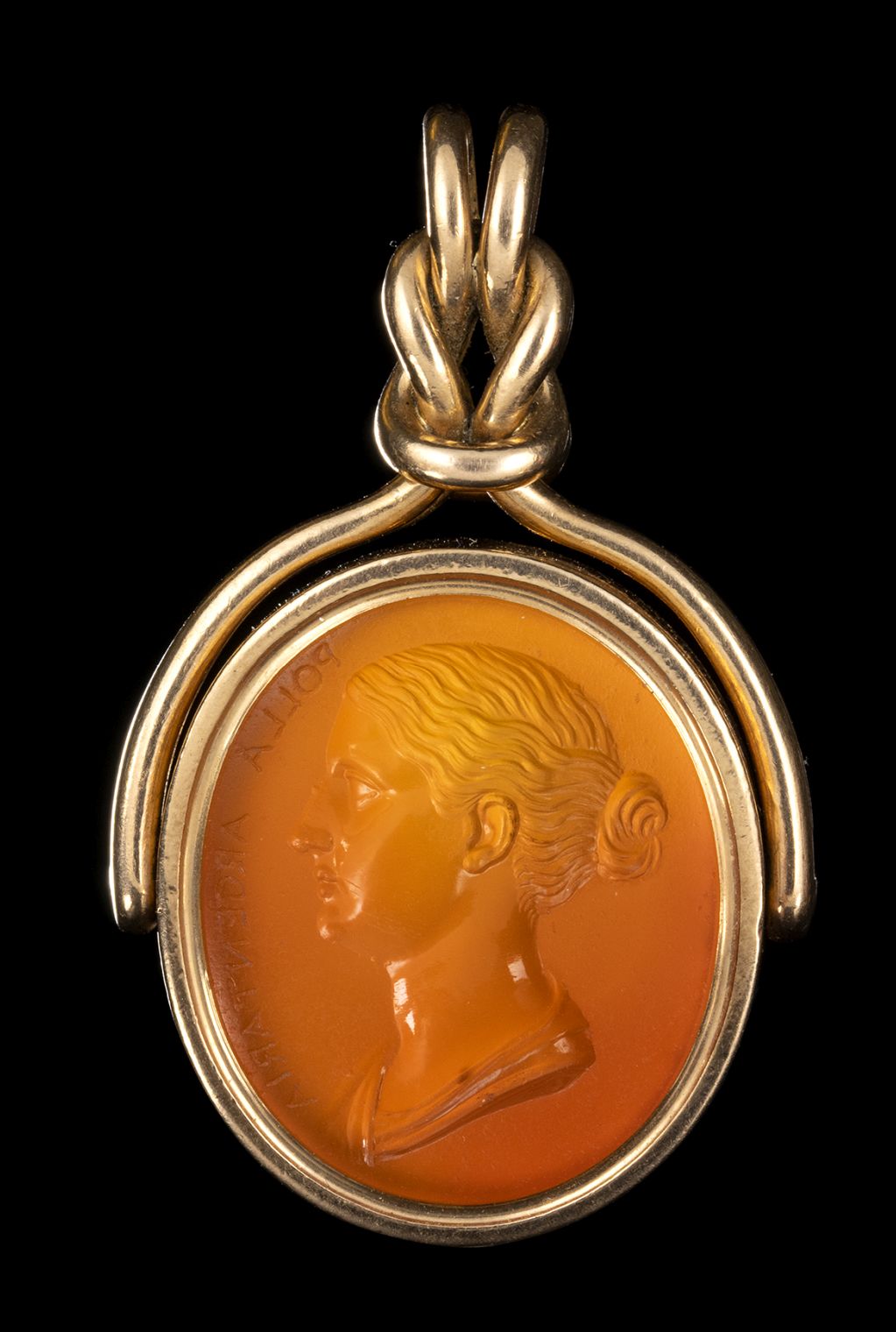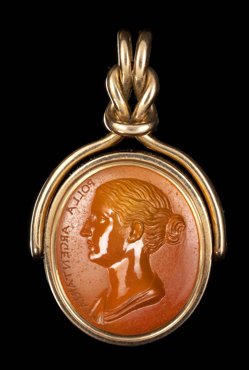 Lotto 419 | A FINE NEOCLASSICAL PONIATOWSKI CARNELIAN INTAGLIO SET IN A GOLD PENDANT. PORTRAIT OF POLLA ARGENTARIA.