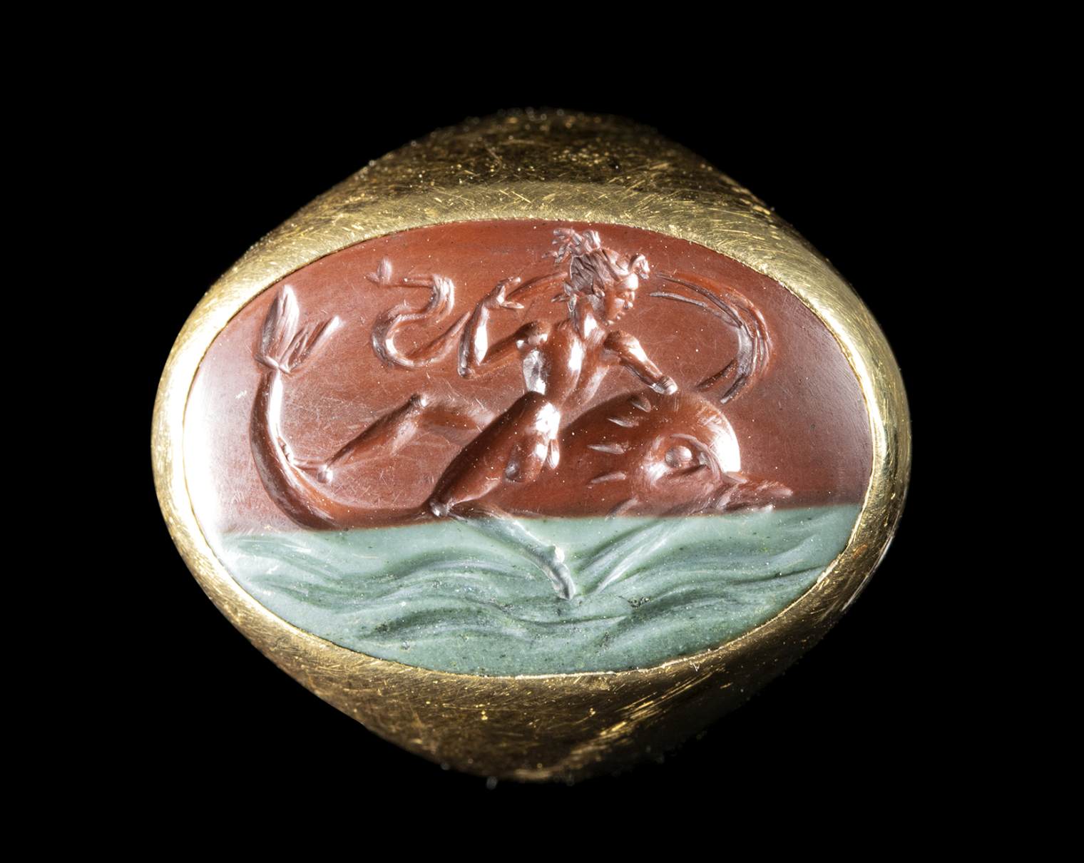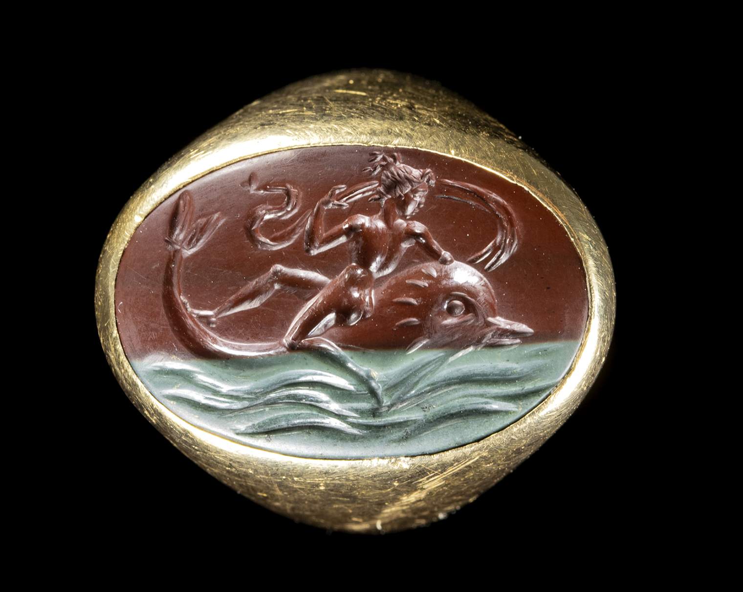 A RARE BICOLOR JASPER SET IN A GOLD RING. VENUS ON A DOLPHIN.