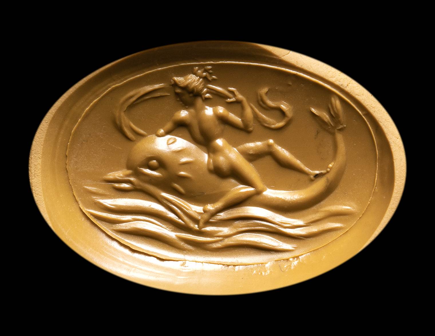 Venus rides a dolphin swimming to right. The figure leans in an almost acrobatic pose, leaning with her right elbow on the rounded head of the animal, with her right foot instead on the tail. With her left hand, the figure holds a drapery that flies with the wind, while her left foot is immersed in the blue water of the sea, rendered in an extraordinary way by the artist who masterfully uses the two colors of the stone. Slight wear marks.