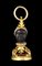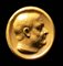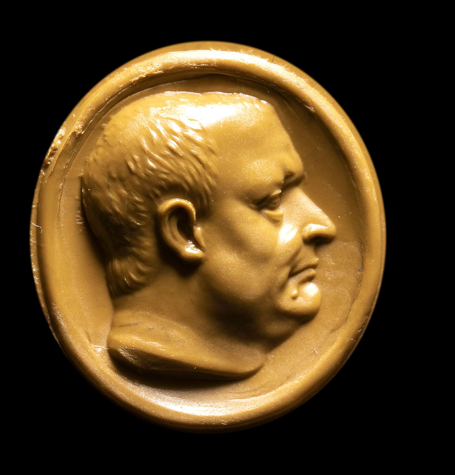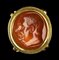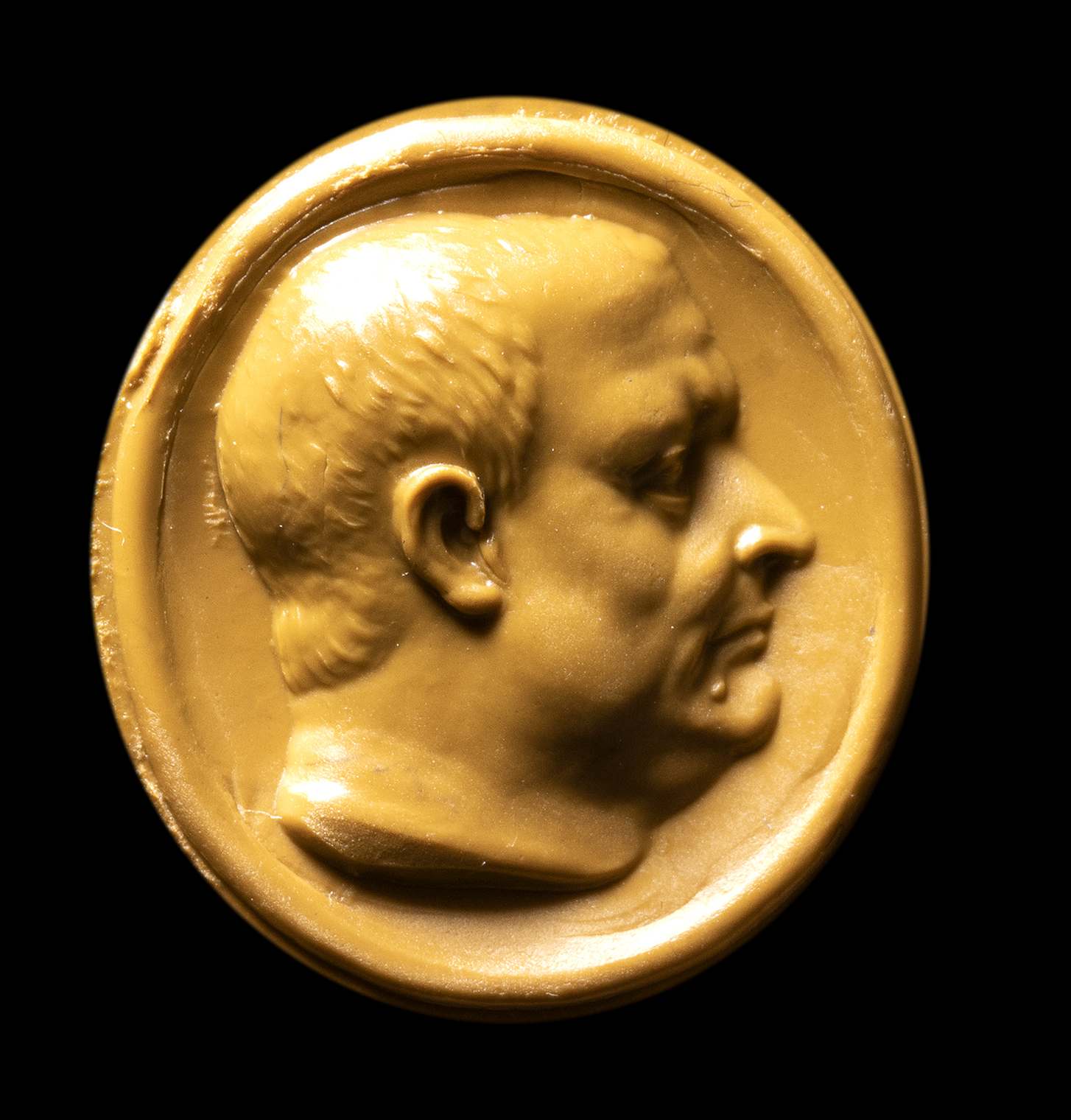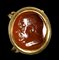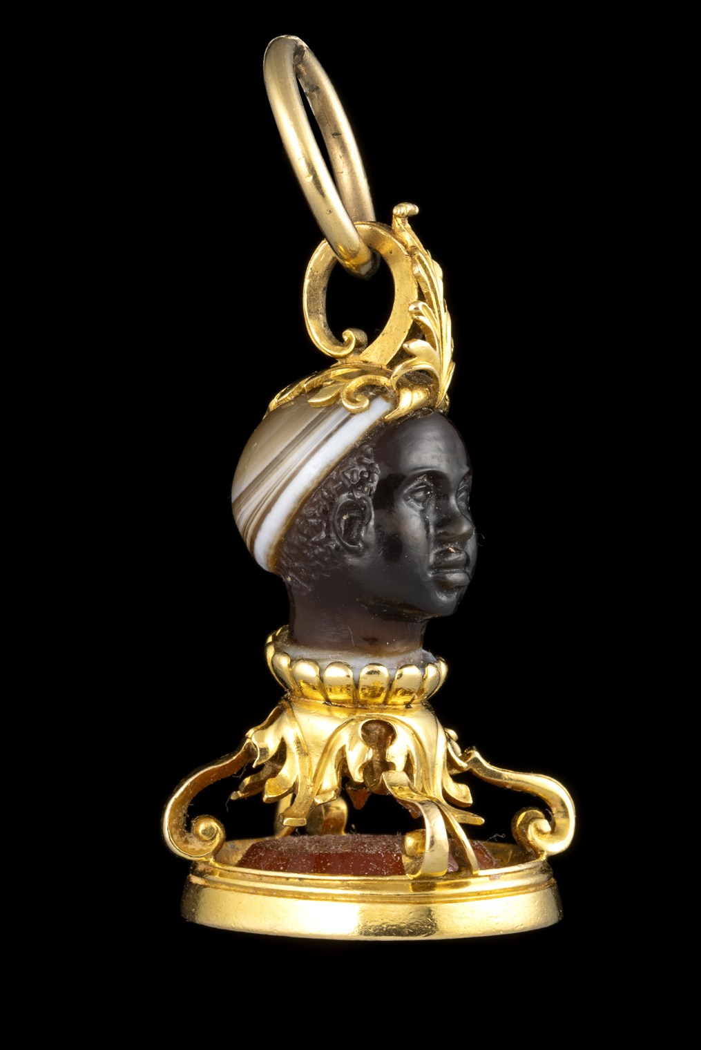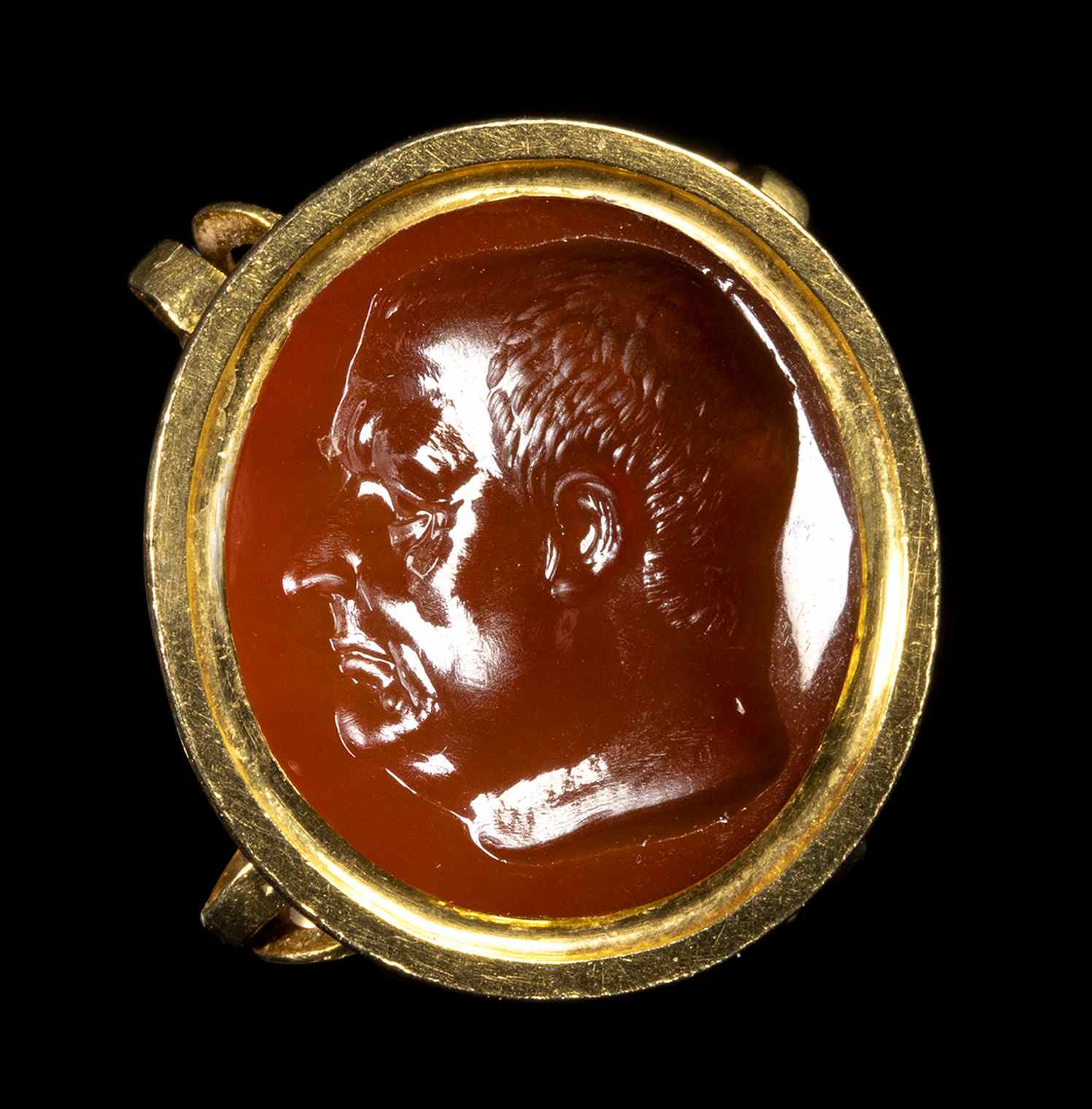A fine portrait of an elderly Roman with close-cropped hair and a wart on his chin. The head is characterized by a pointed nose, narrow lips and pronounced chin, wide neck with goitre, small ear, close-fitting hair. This fine intaglio is apparently the exact copy of an ancient roman chalcedony intaglio, from George James Howard coll., 9th Earl of Carlisle. The stone is set in a splendid gold fob seal composed by a leaves ornamental patterns attached to the bezel, ending with a finely carved banded agate moore head with an additonal chiseled plants pattern motifs with a suspension ring. Very good condition.