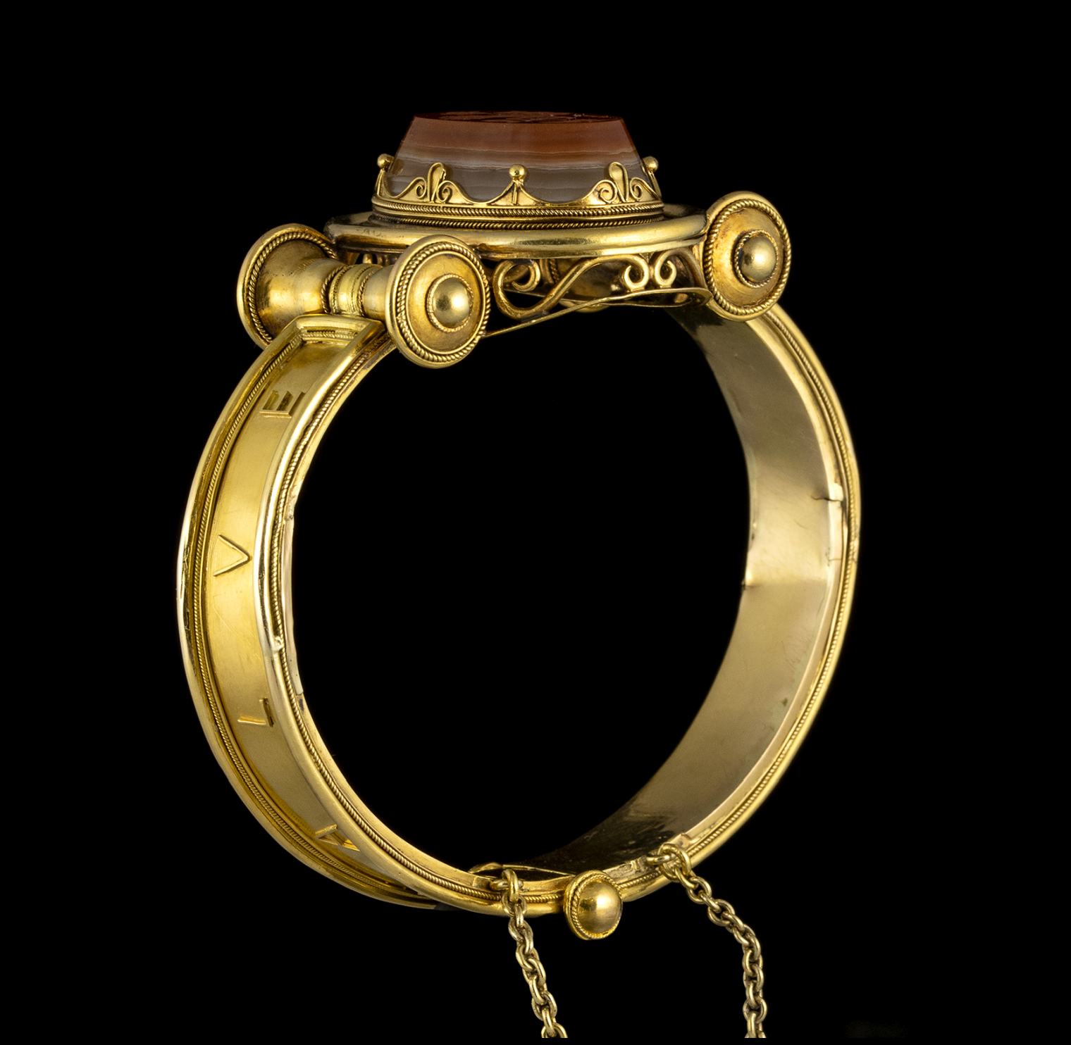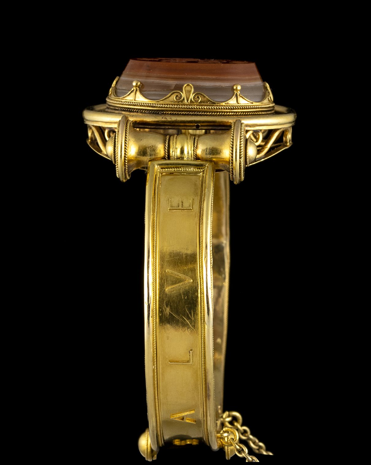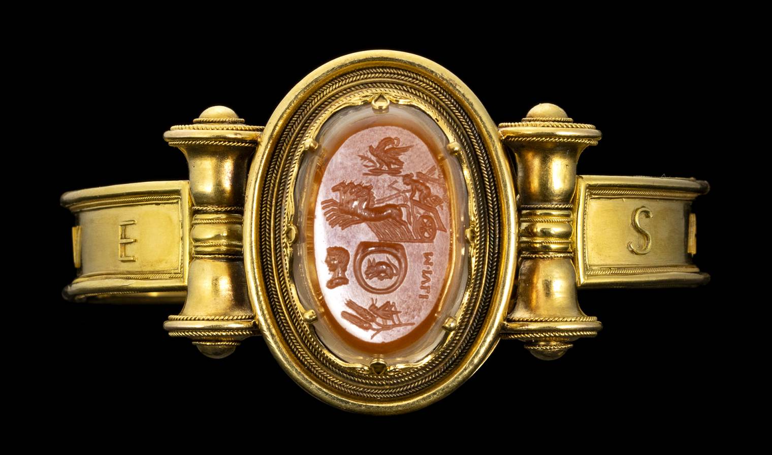 PIERRET Ernesto (Born in Paris, 1824). A Gold bangle bracelet set with a large agate intaglio. Circa 1860