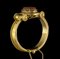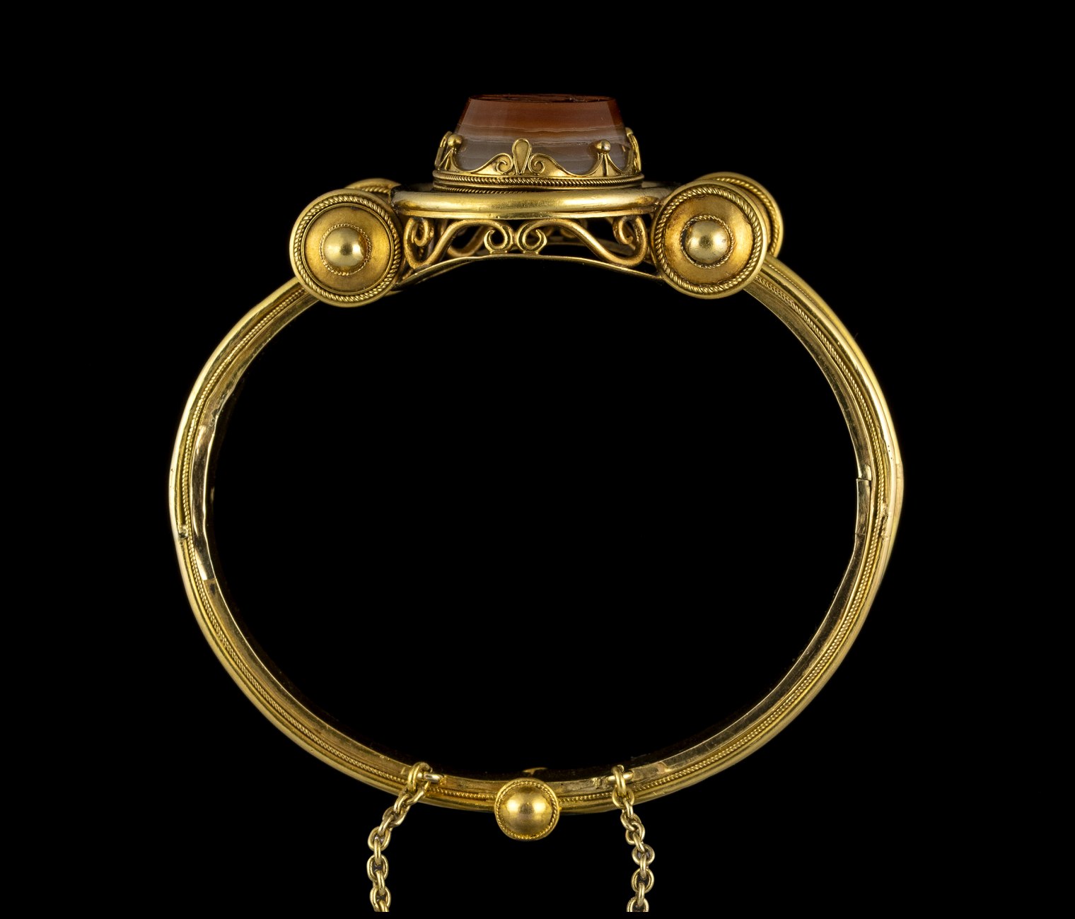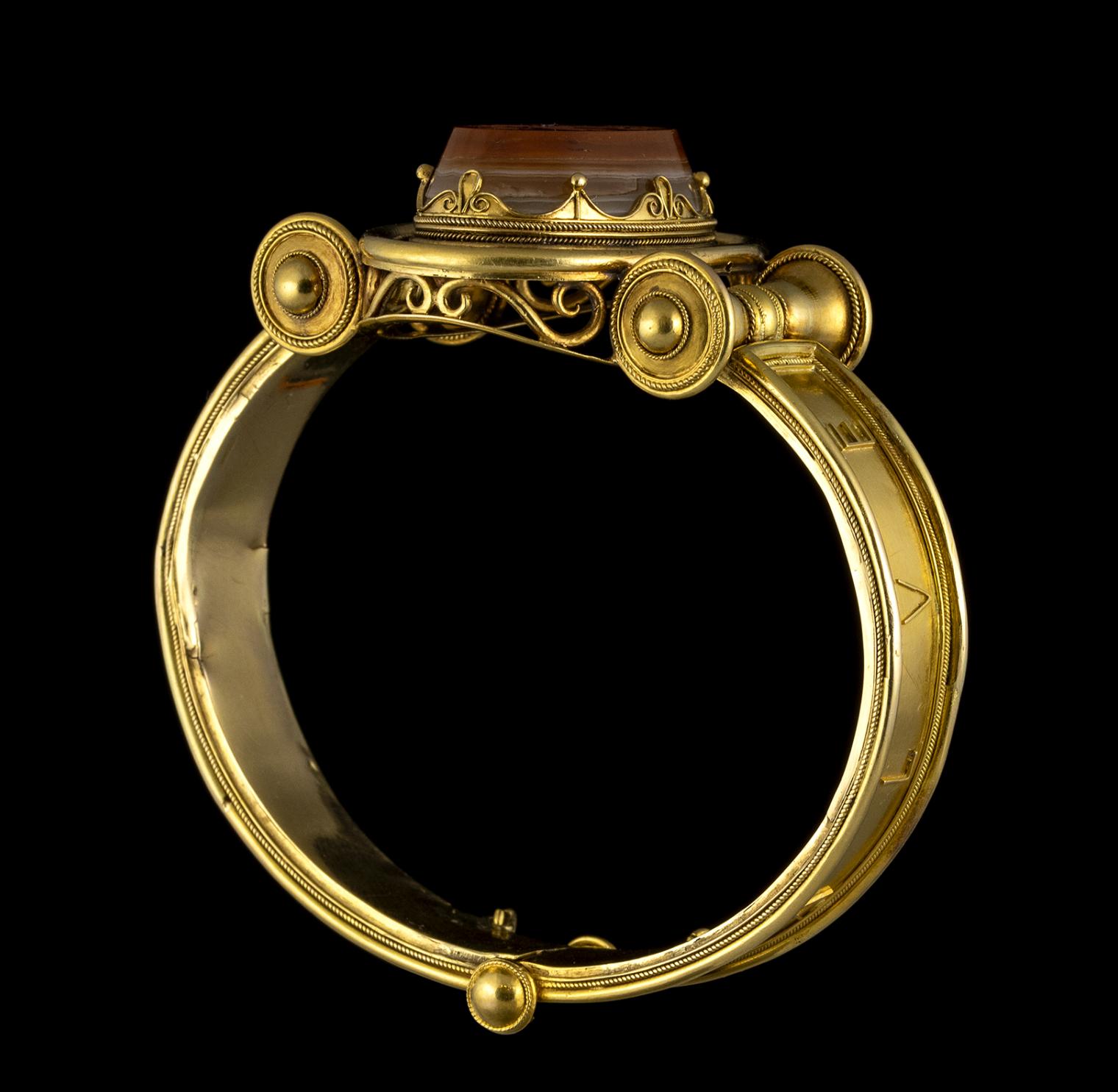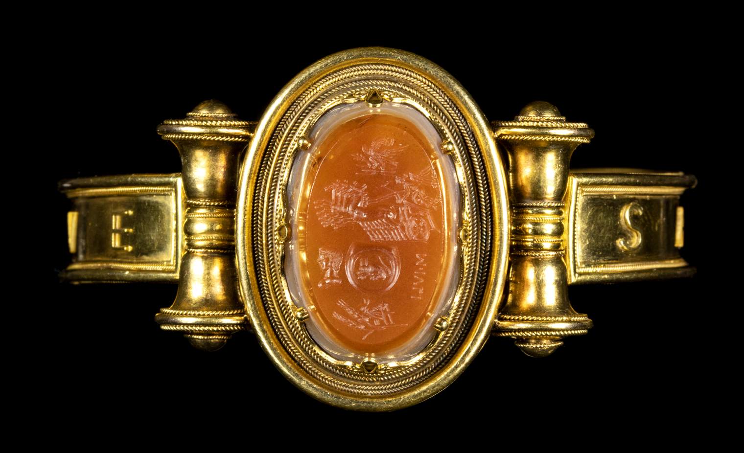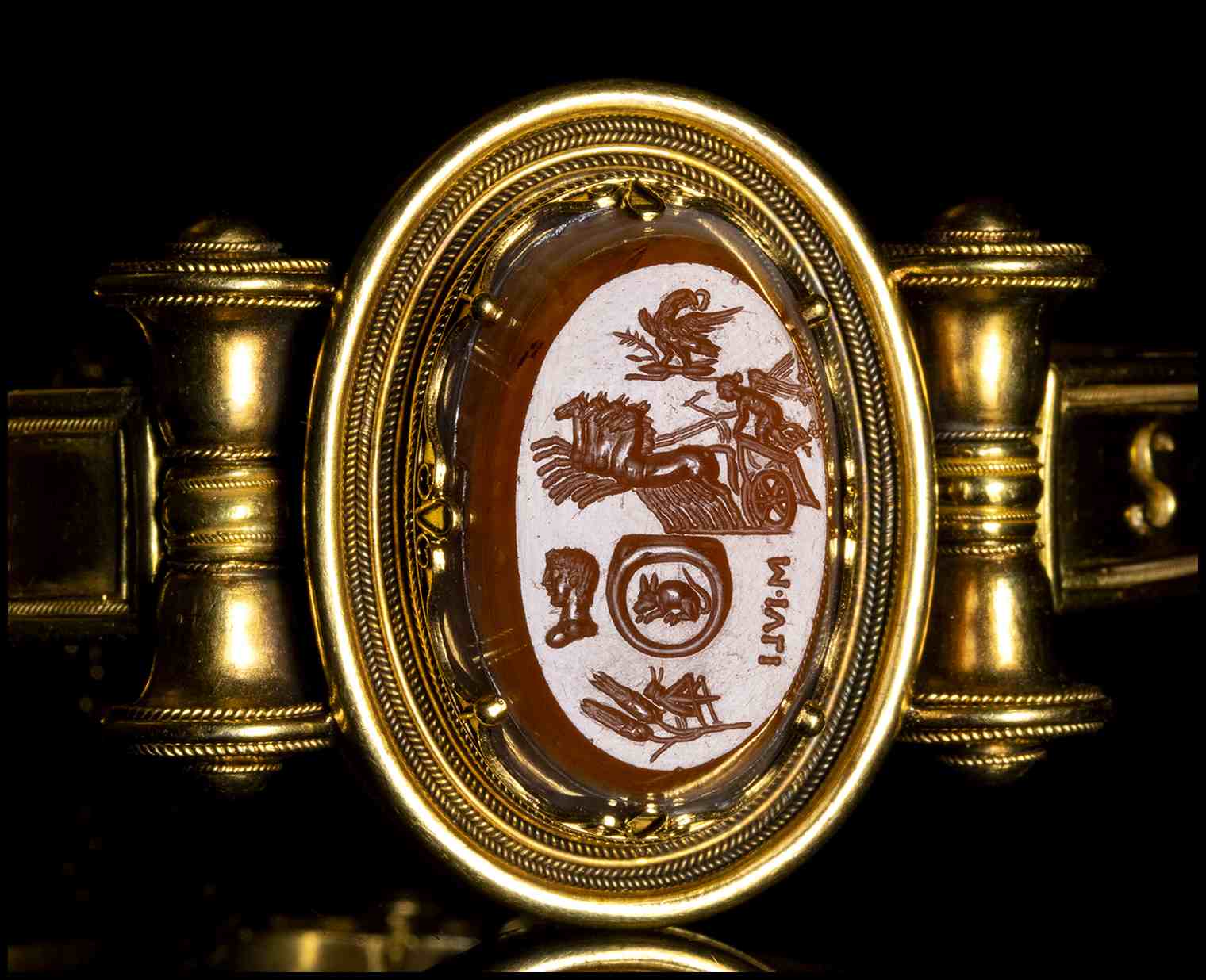 Of archaeological revival design, the oval intaglio, possibly a merchant’s seal, within a rope twist surround, two scrolls to either side, the bangle inscribed ‘SALVE’, translating s the Latin for ‘Hail’.