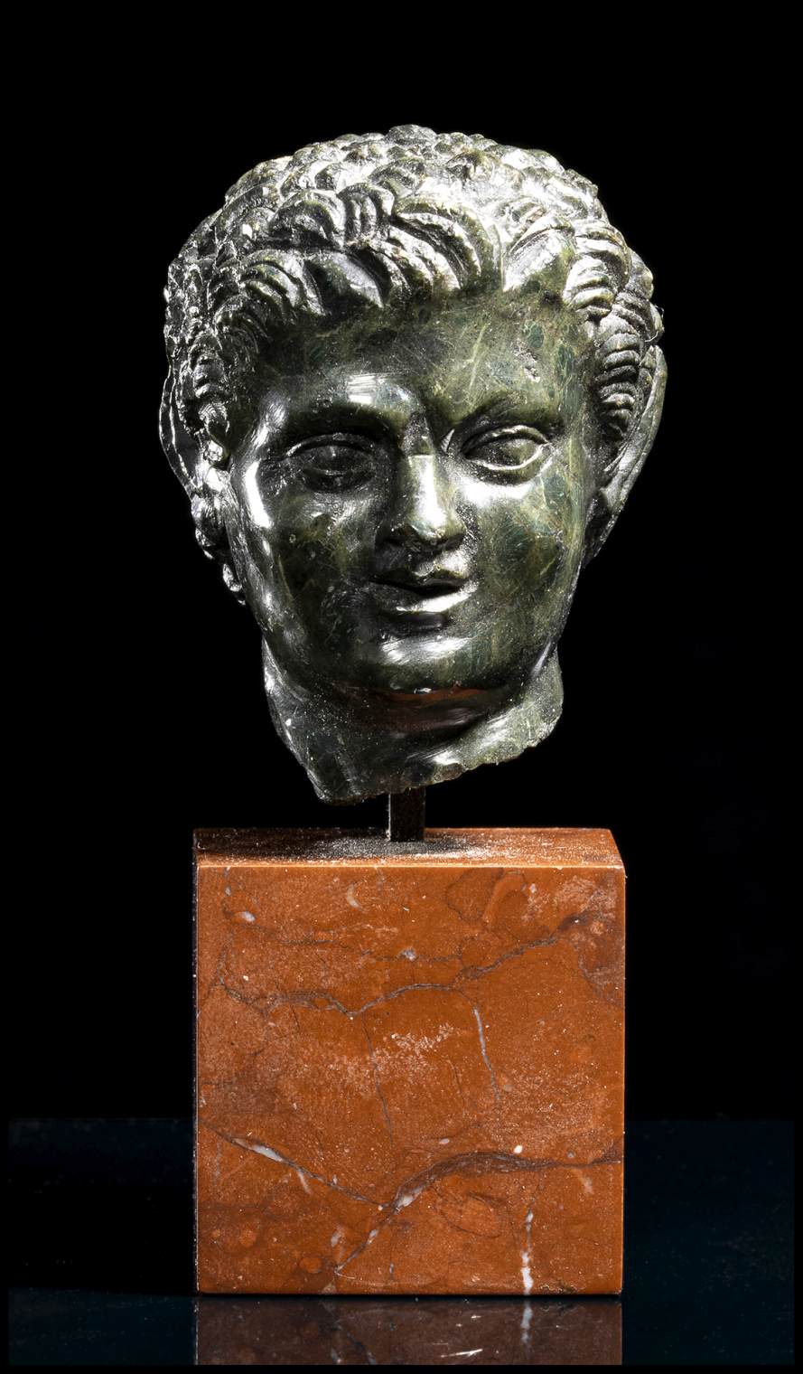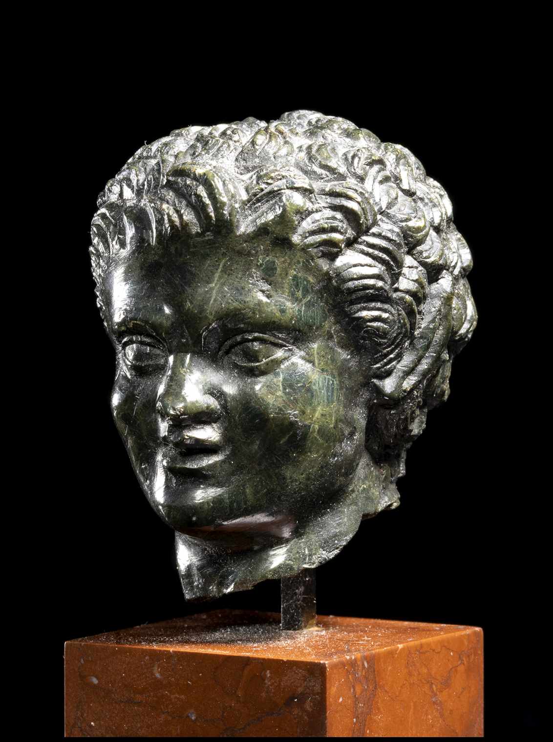 Lotto 430 | A MOTTLED GREEN JASPER OR SERPENTINE SCULPTED HEAD OF A FAUN.