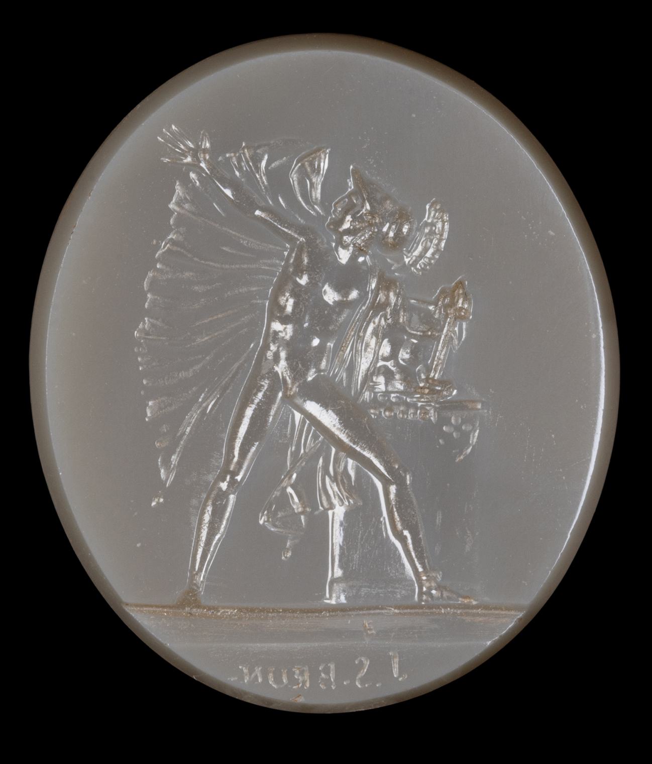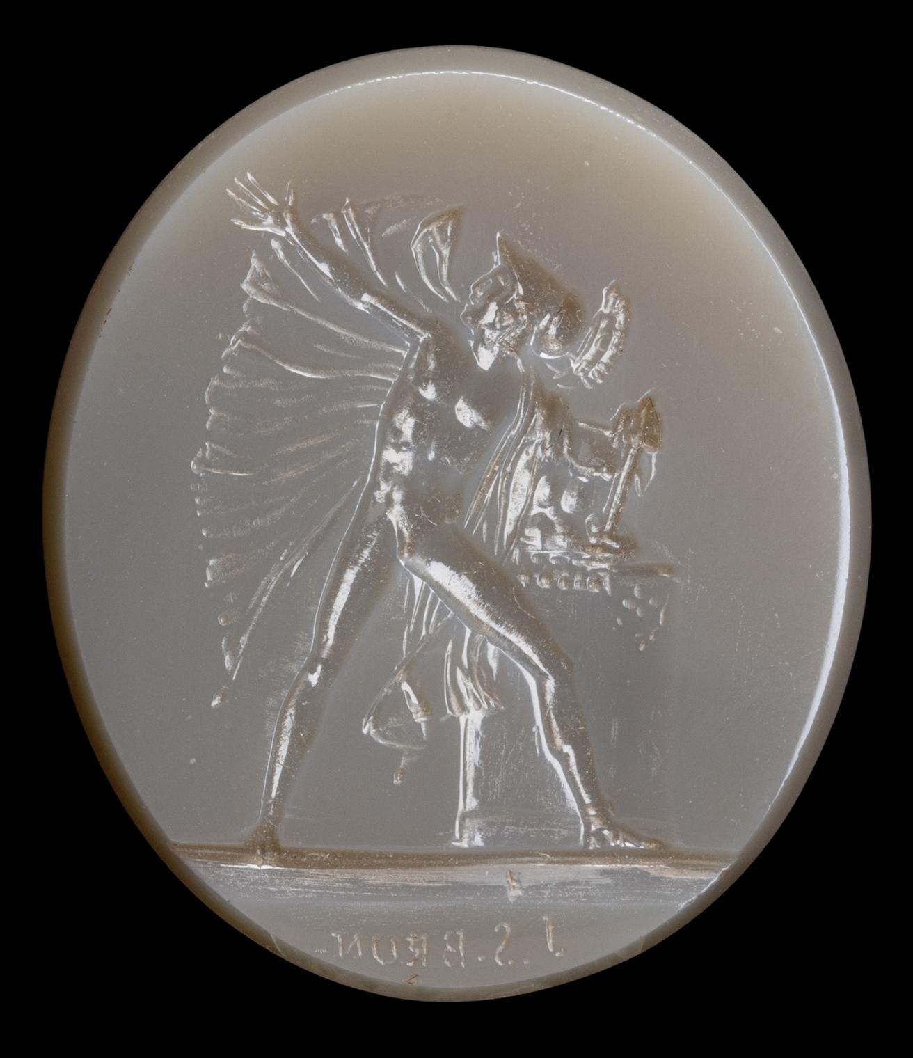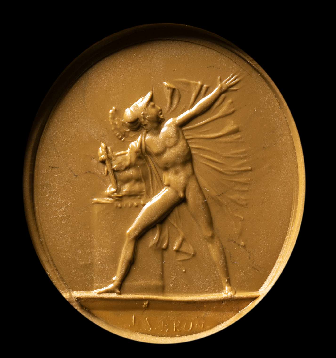 This scene, with some variations, is recordered in the Paoletti collection, inv.n°.MR27830 (see L. Pirzio Biroli Stefanelli, La collezione Paoletti, Rome, 2012, vol.VIII.I.n°2). Behind the groundline, the signature J.S. Brun. Joseph Silvestre Brun was a French gem engraver, student of François Lemot, François Jouffroy and Nicolas Augustin Matte. Brun was awarded the First Prize of Rome medal engraving in 1817 based upon a depiction of Androcles and the lion. He also executed a silvered bronze medal in 1825 to celebrate the coronation of Charles X of France in Reims.