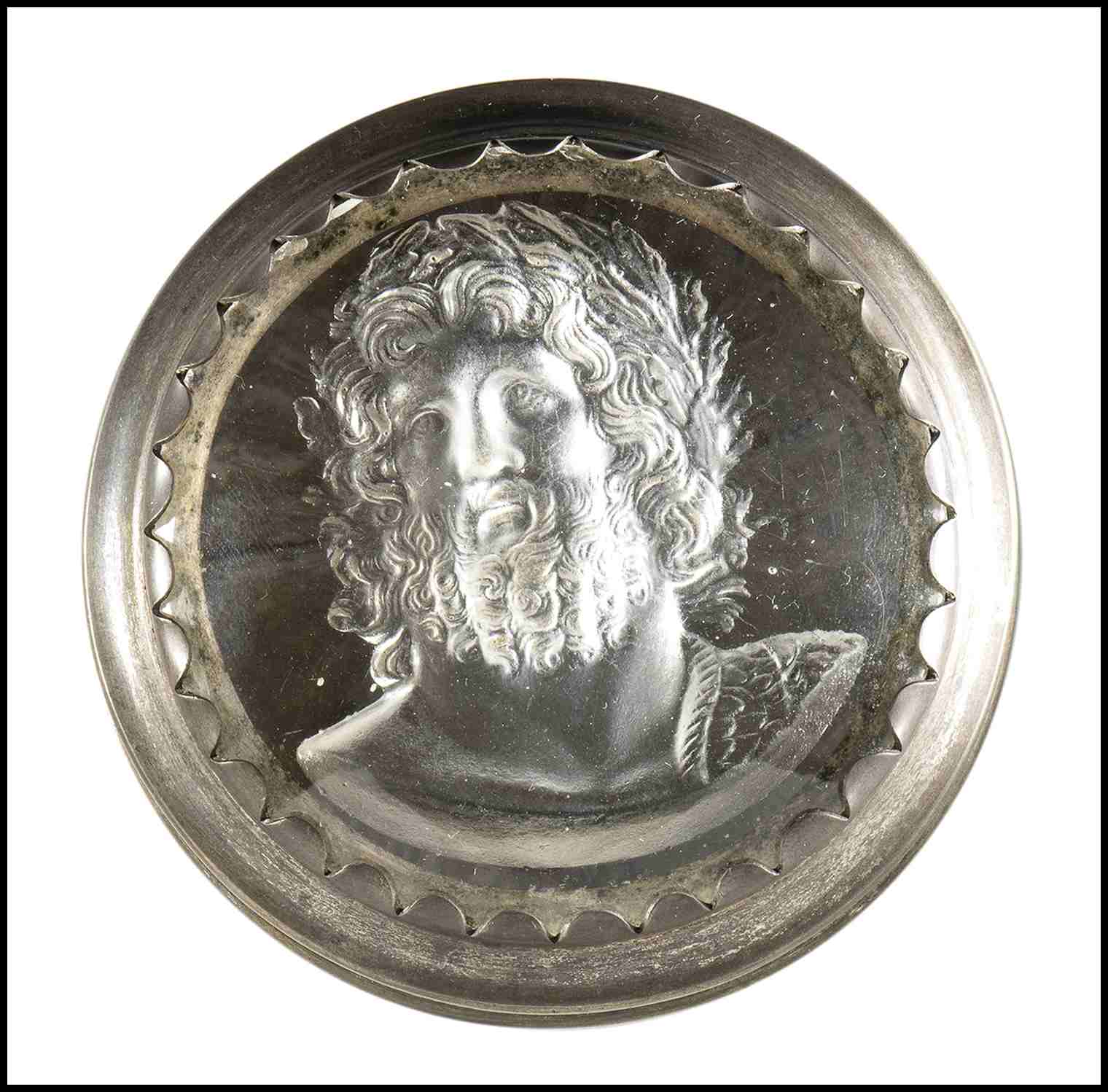 Large glass intaglio from an impression of an ancient cameo from the 2nd century B.C., representing the bust of Jupiter Ægiochus, known under the name of "Cameo Zulian". Found in Ephesus, it is kept today in the Archaeological Museum of Venice. The god, bearded, wears a crown of foliage and the aegis. The molding was executed in very thick glass surrounded by a silver box.