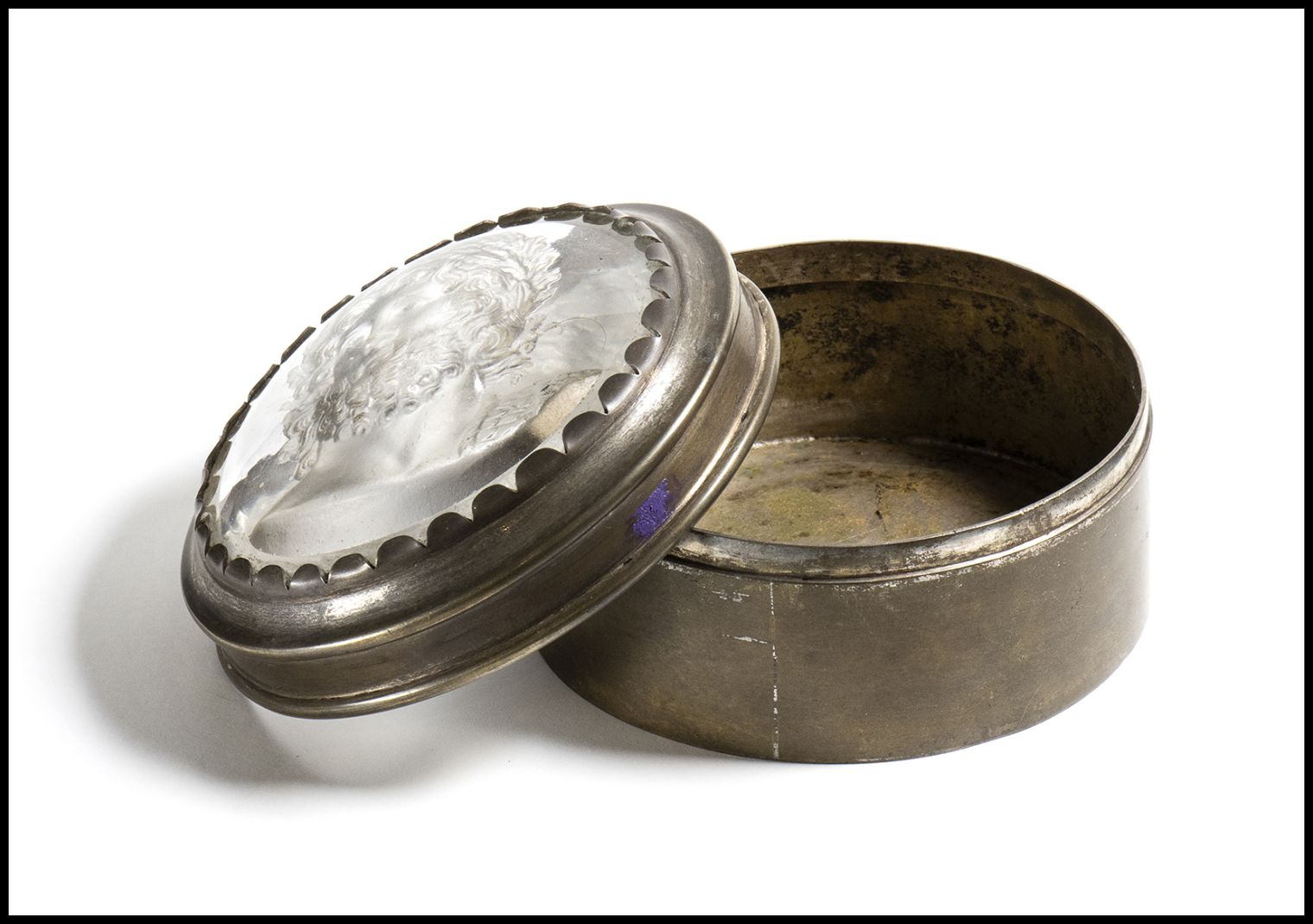 A SILVER BOX WITH A GLASS IMPRESSION. BUST OF JUPITER.